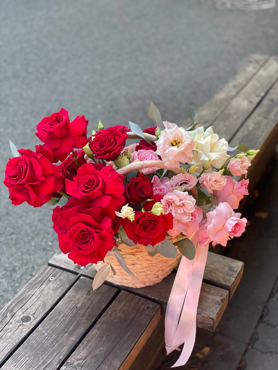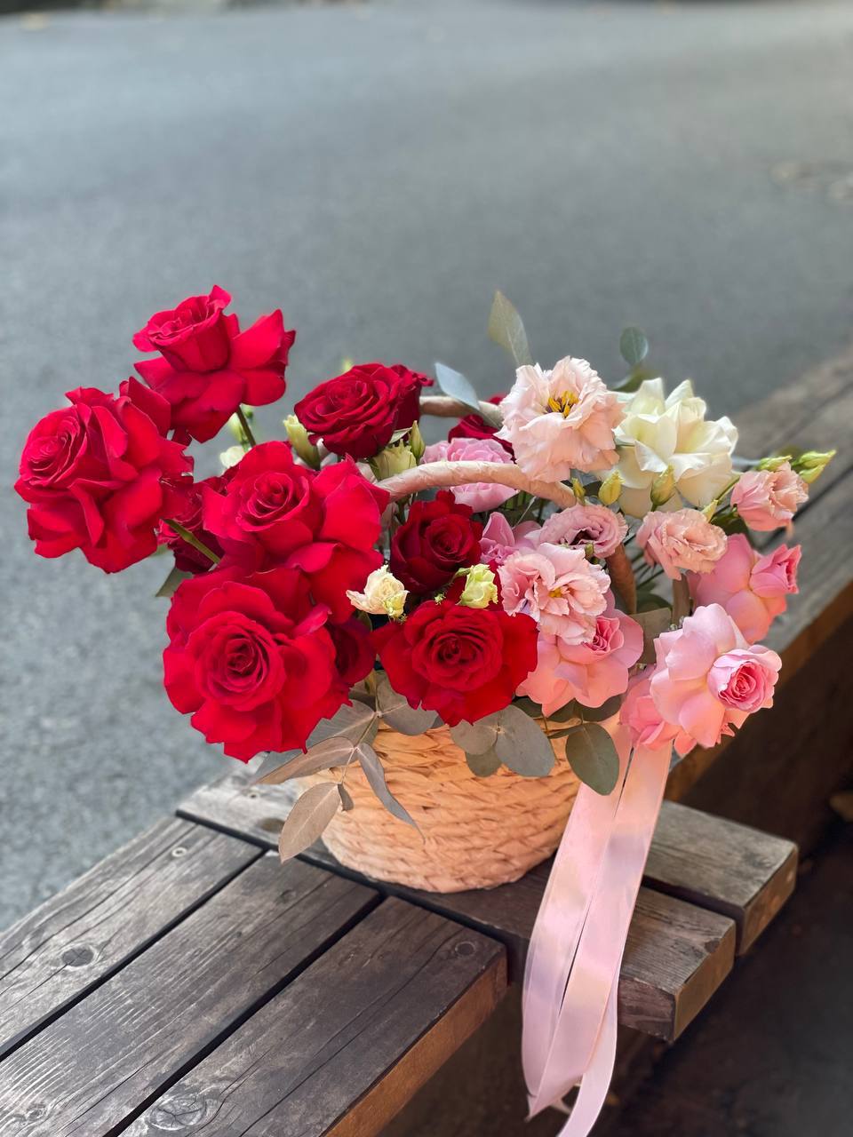 Двадцать пять французских роз в корзине создают плавный переход от светлых розовых тонов к насыщенной фуксии. Эвкалипт добавляет свежести и завершает композицию естественной зеленью. Букет удобно разместить на столе или комоде благодаря устойчивой корзине.