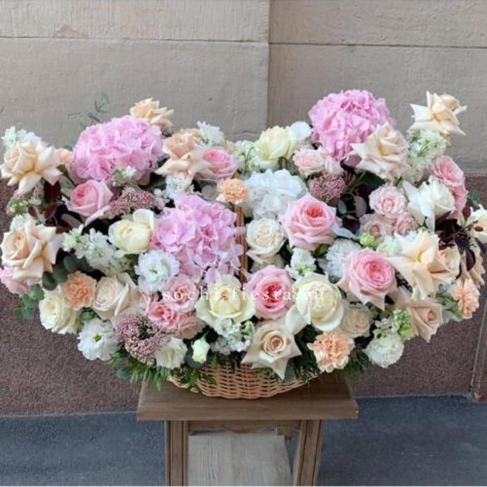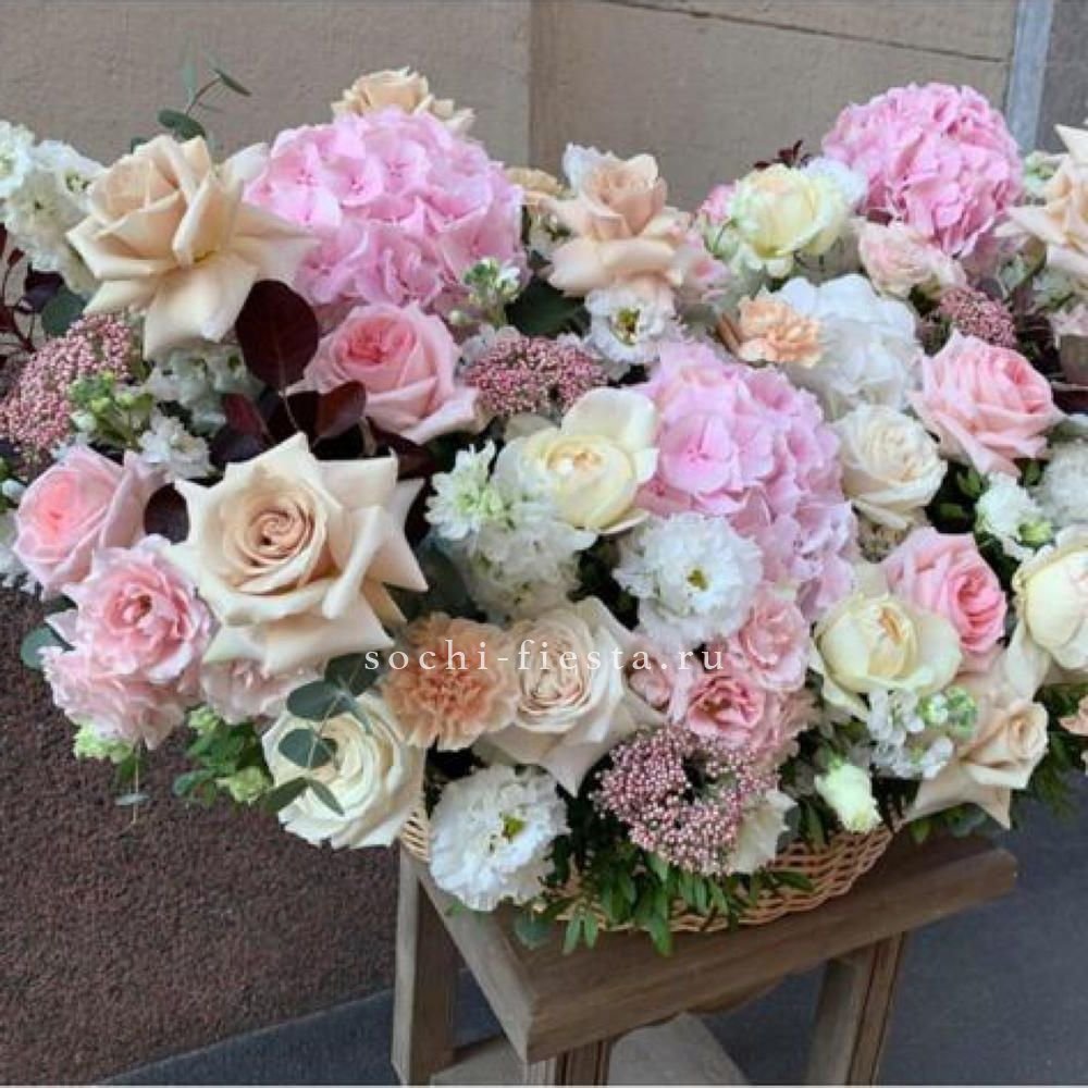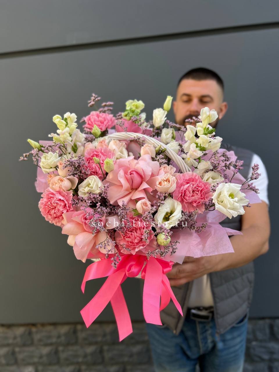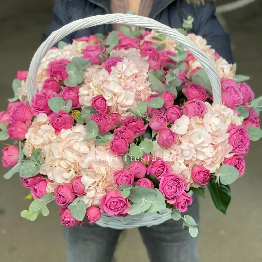 Сорок одна пионовидная роза в светлой корзине выстраивает объёмную композицию с мягкими переливами лилового и розового. Эвкалипт обрамляет густую россыпь бутонов.