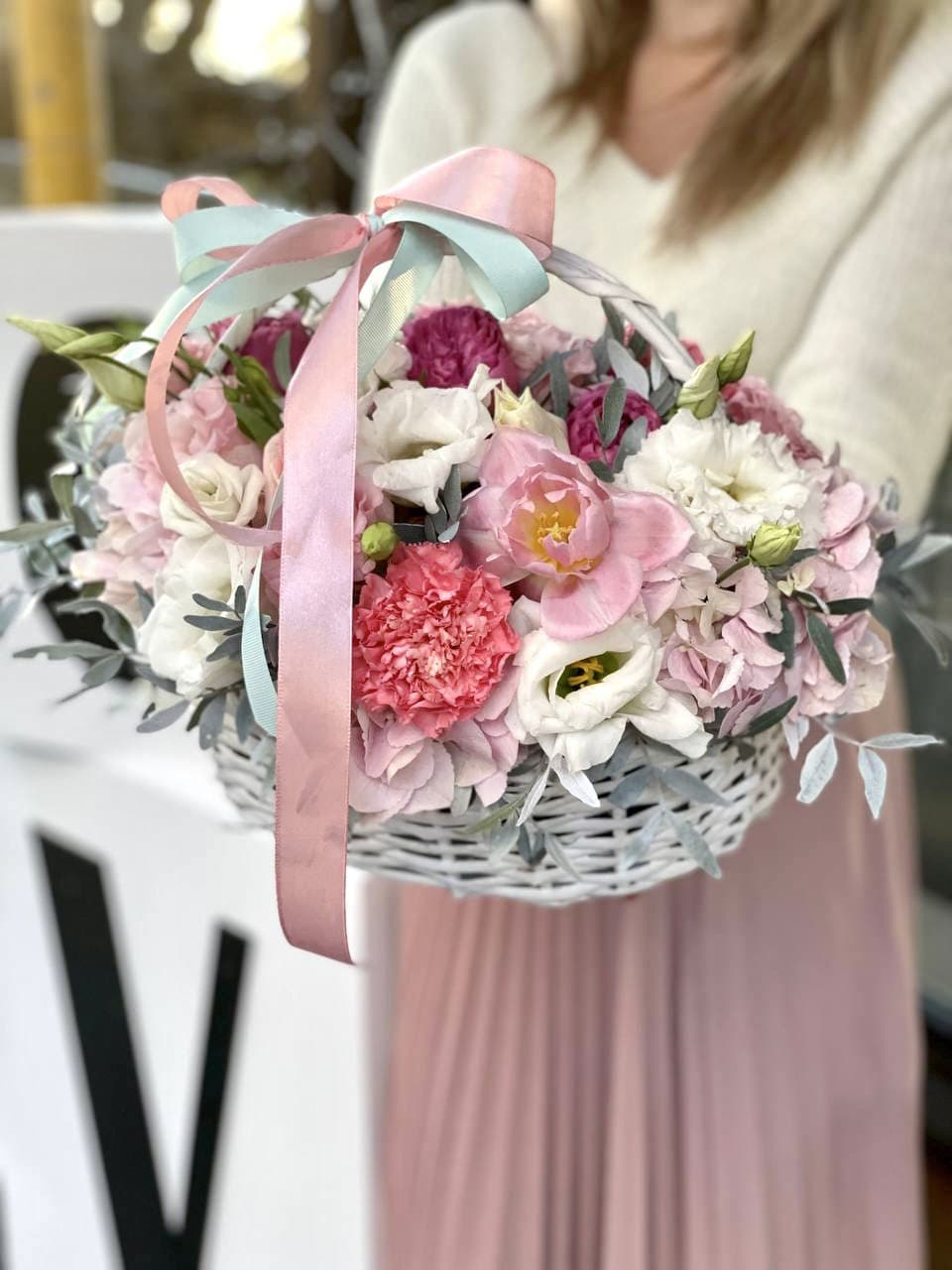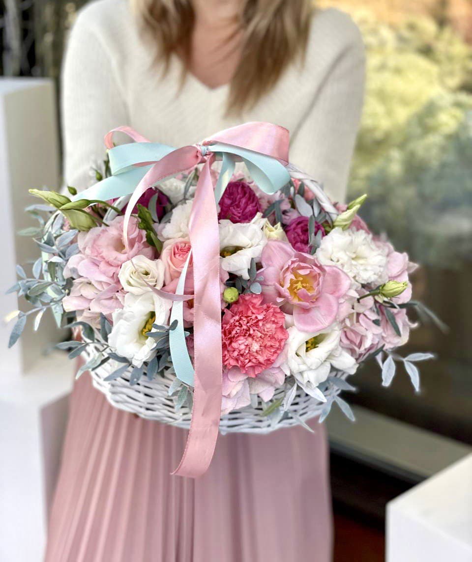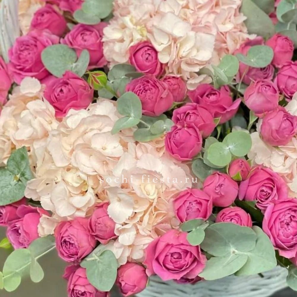 41 пионовидная кустовая роза Misty Bubbles, эвкалипт, светлая корзина.