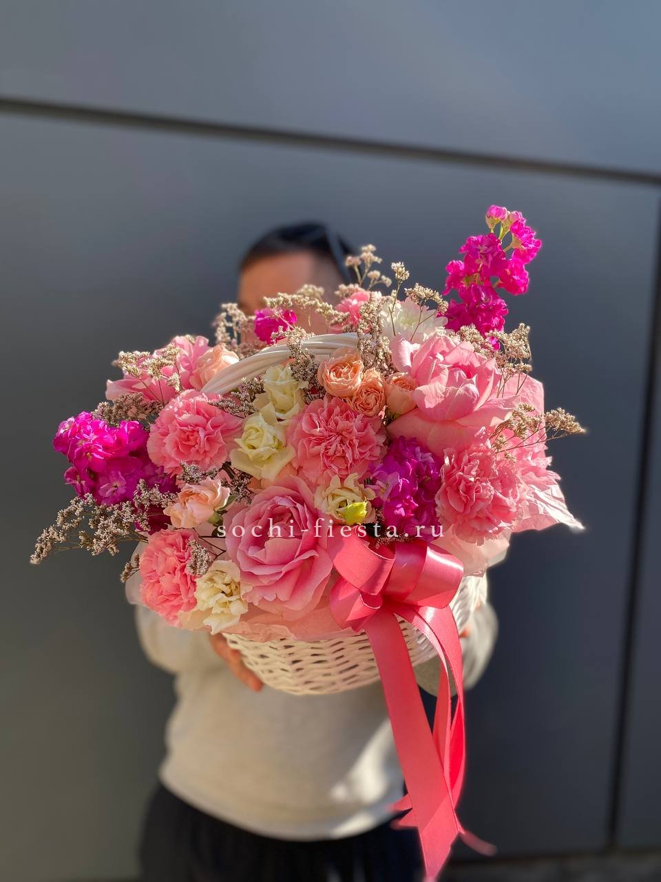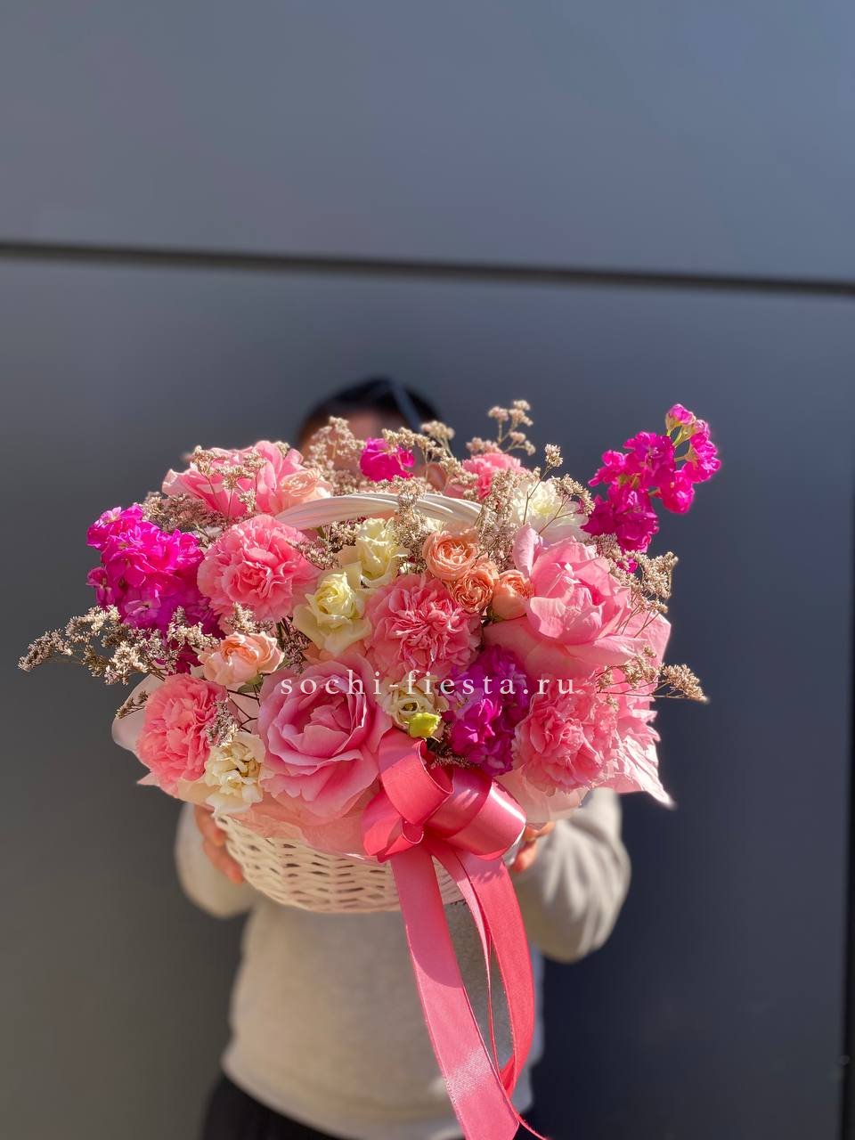 диантус, роза кустовая, гипсофила, гортензия, дельфиниум/львиный зев/маттиола (замена вне сезона), белая роза, георгины или аналог, эвкалипт, оазис, корзина D 25, двойной бант Состав композиции может быть незначительно изменен флористом в процессе изготовления с соблюдением стилистики, фактуры и цветовой гаммы оригинала.