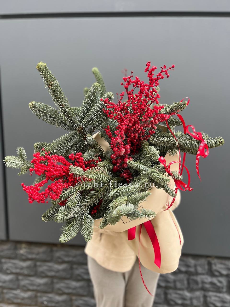 Живые ветви нобилиса переплетаются с красными ягодами илекса. Вертикальная сборка создаёт ритм между хвойной зеленью и ягодными гроздьями. Букет держит форму и долго сохраняет свежесть.