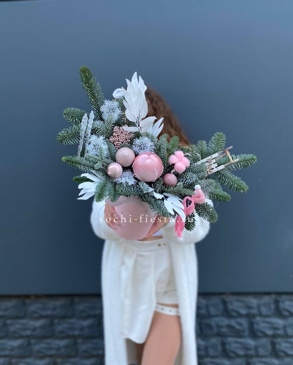 Композиция в виде саней сочетает свежую хвою нобилиса с новогодними украшениями. Компактная форма позволяет разместить её на узкой поверхности.