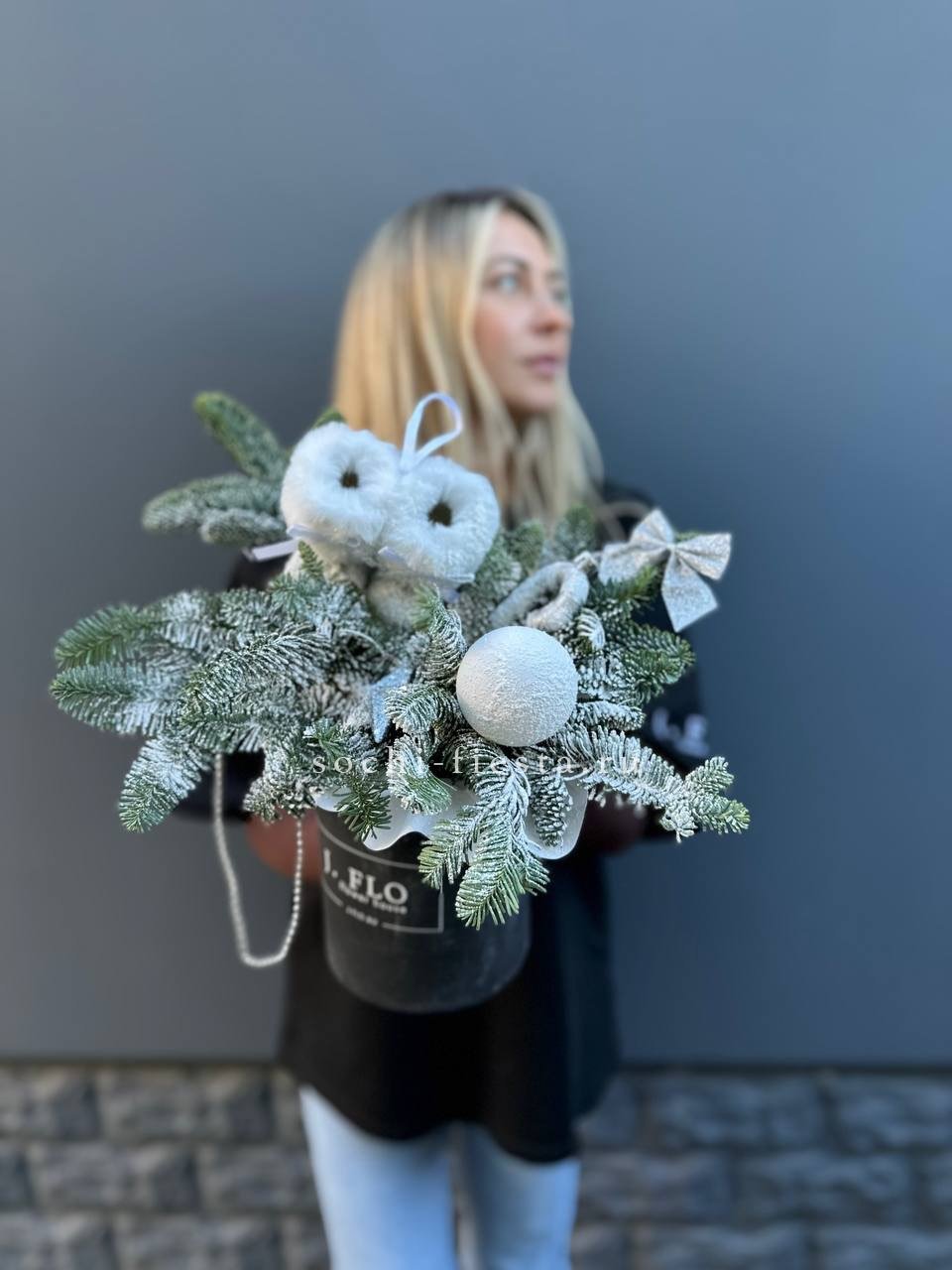 Белоснежные сапожки и хвоя нобилиса собраны в компактную праздничную форму. Матовые шары добавляют объём и завершают зимнюю картину без лишних деталей.