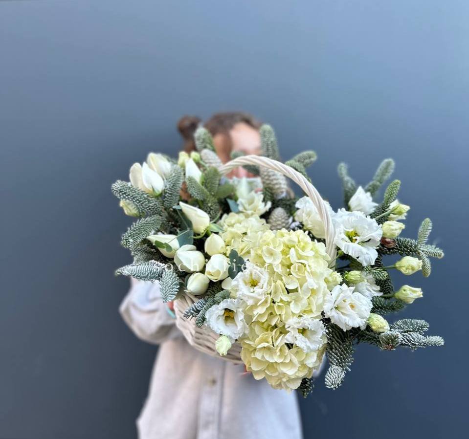 Белоснежные розы и эустома соседствуют с воздушными соцветиями гортензии среди хвойных веток. Корзина объединяет цветочную свежесть и праздничную атмосферу в удобной форме.