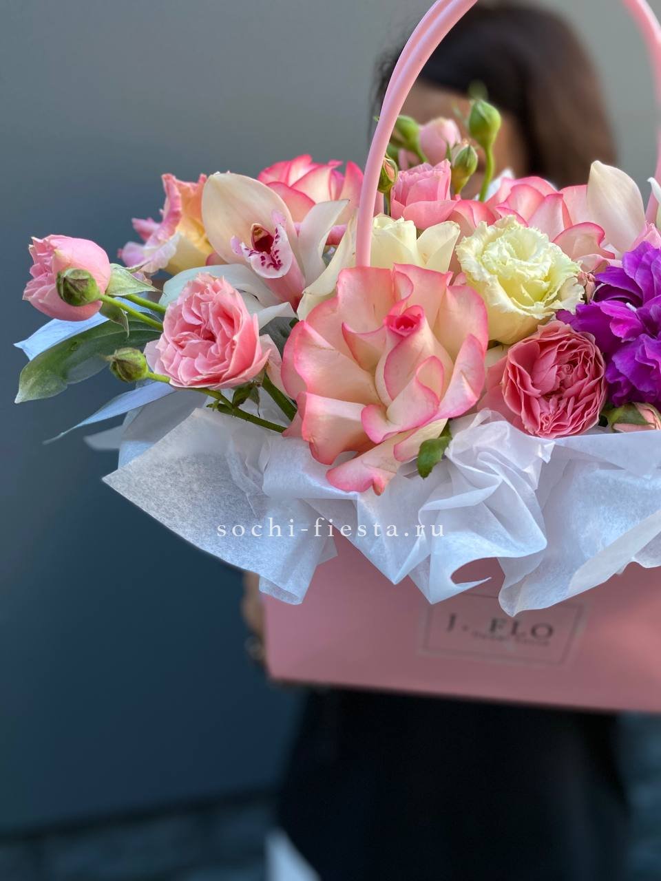 орхидеи, розовые розы, эвкалипт, гипсофила, джут кашпо.