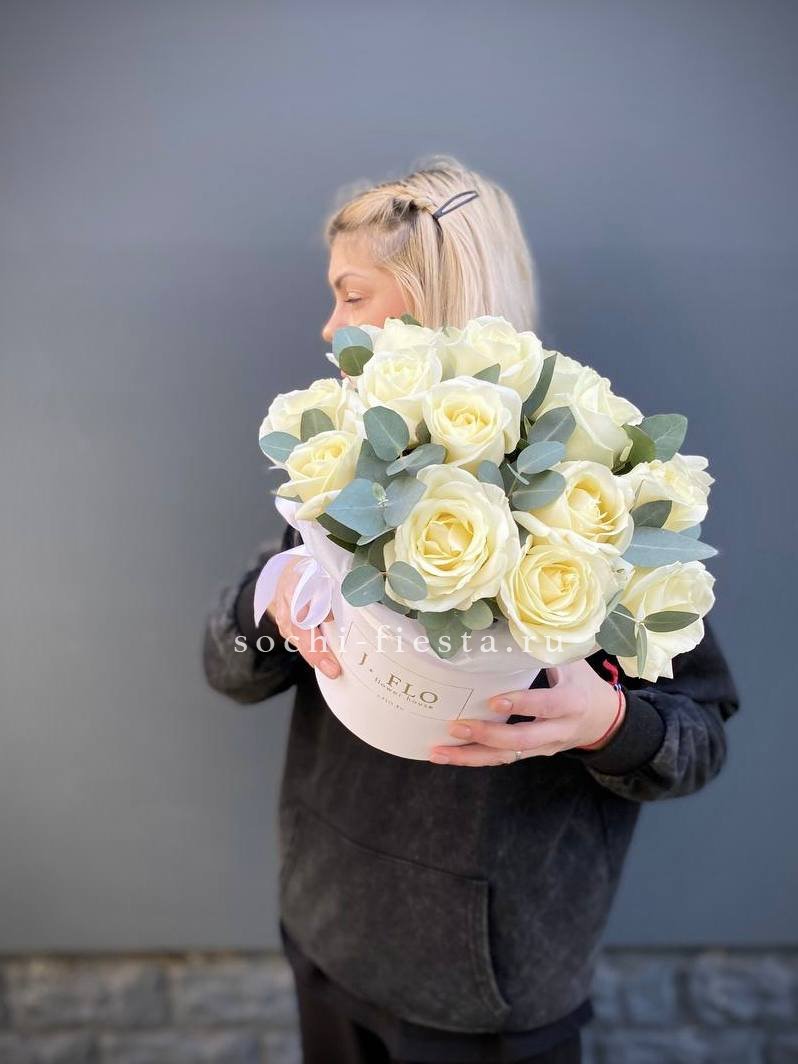 Белоснежные орхидеи и розовые розы собраны в природном джутовом кашпо. Воздушная гипсофила добавляет композиции легкости, а эвкалипт привносит свежие нотки.