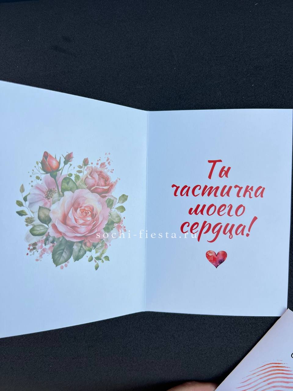 открытка для влюбленных, внутри надпись: Ты частичка моего сердца! Открытка идет в дополнение к основному подарку: букет, композиция. Размеры: 10х15см.