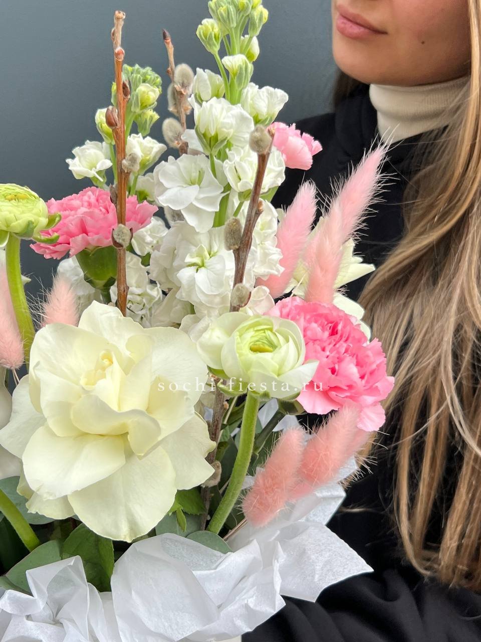 Цветочная композиция идеальна для Православных Праздников! Состав выполнен из белых роз, вербы, маттиолы, лагуруса и керамического кролика!