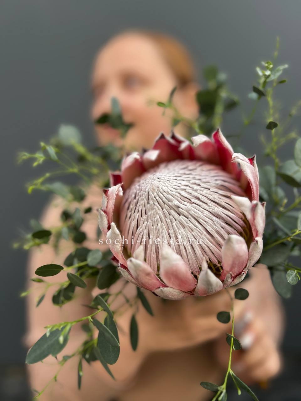 Крупные соцветия протеи создают графичную композицию с чёткими линиями и природной архитектурой. Ветки эвкалипта добавляют воздушности и завершают форму. Букет для церемонии в естественной стилистике.