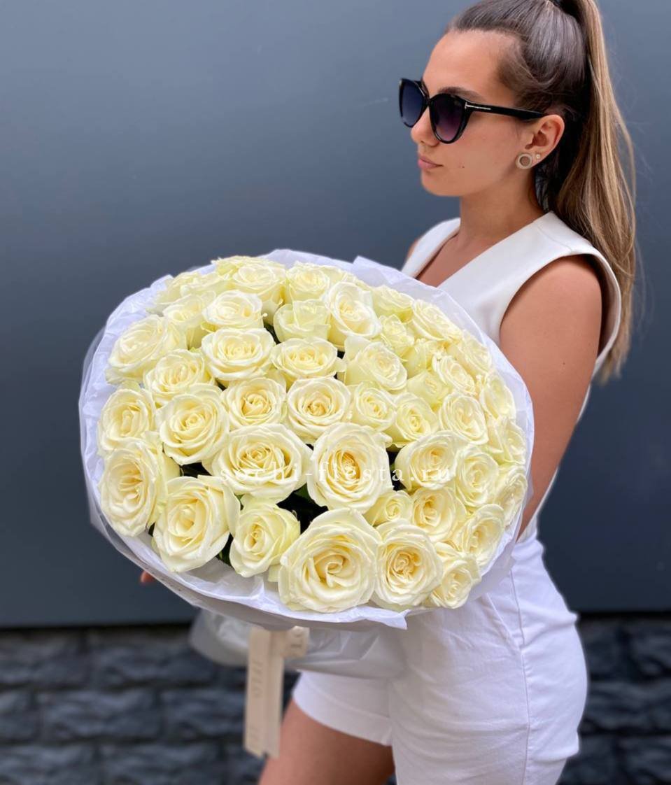 Вывернутые лепестки французских роз Notte Bianca раскрываются широко и создают объемную текстуру. Двадцать пять бутонов в окружении эвкалипта выглядят современно и графично.