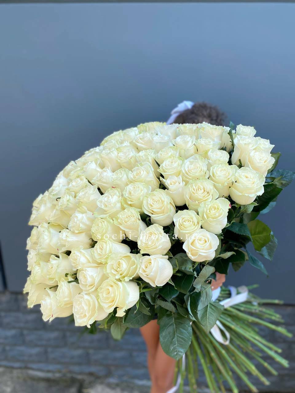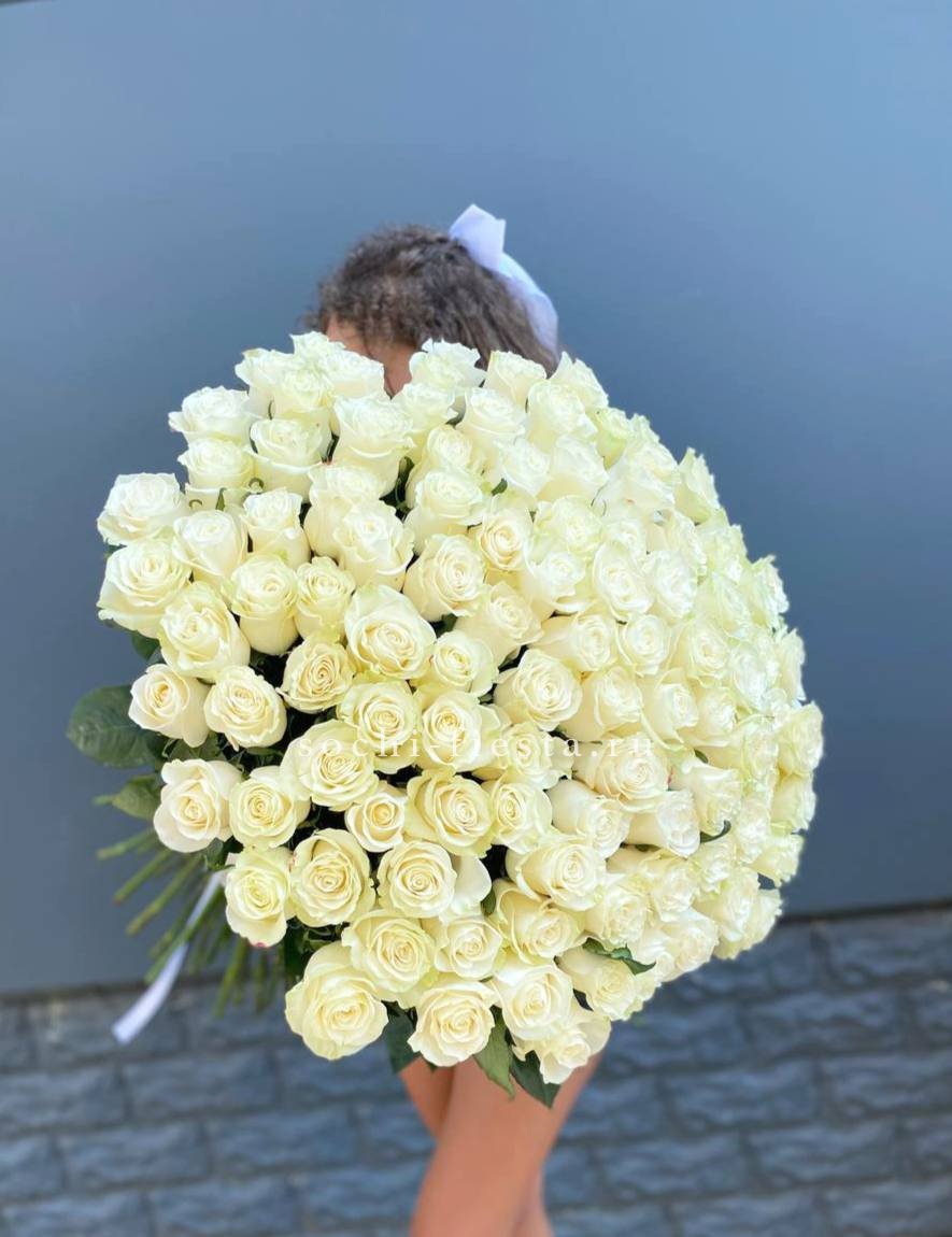 Двадцать пять вывернутых бутонов формируют объемную композицию с выразительным присутствием. Белые лепестки и зелень эвкалипта создают ощущение простора и легкости.