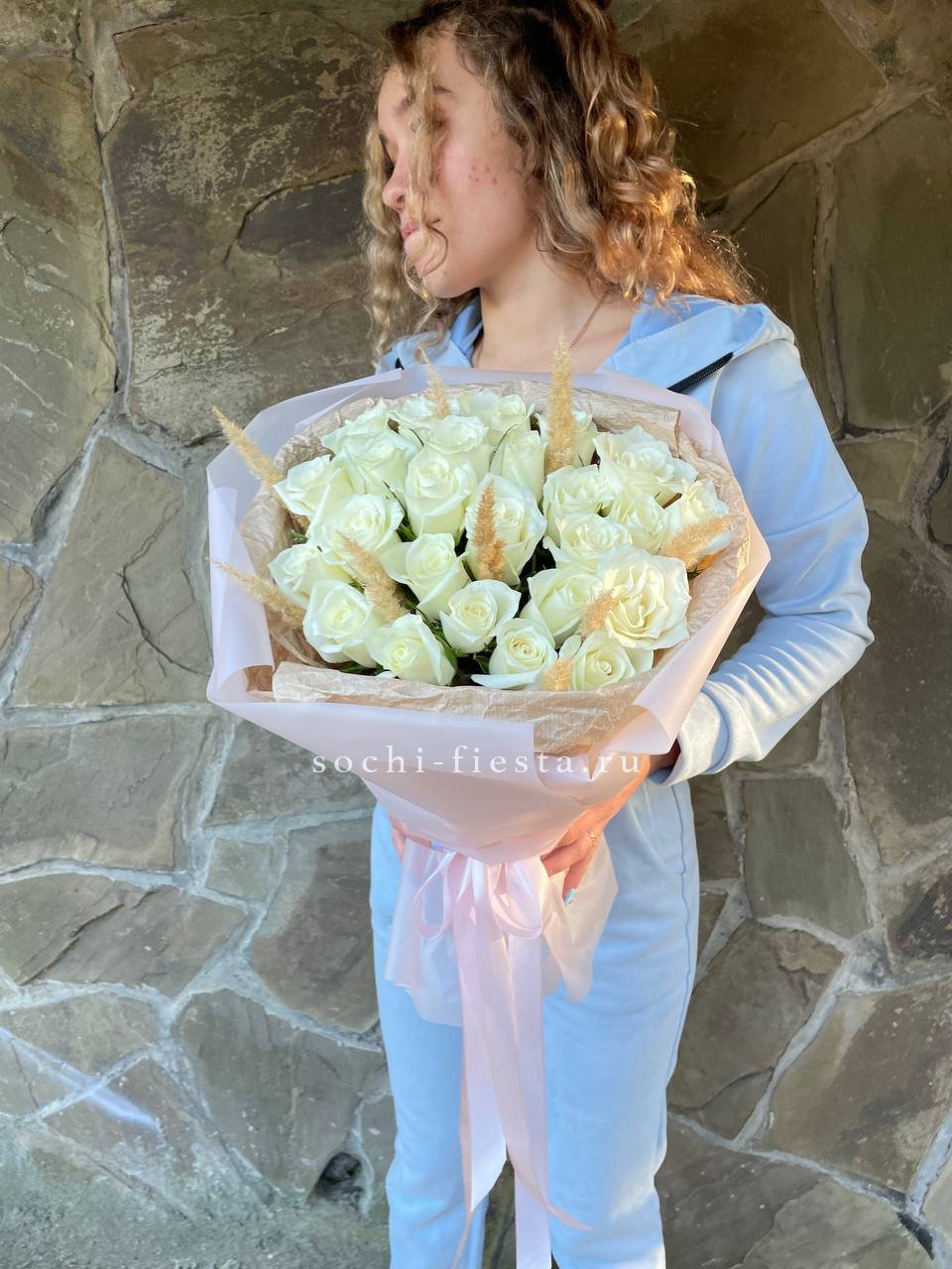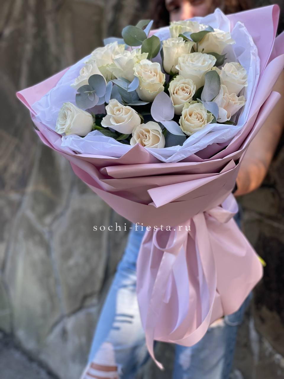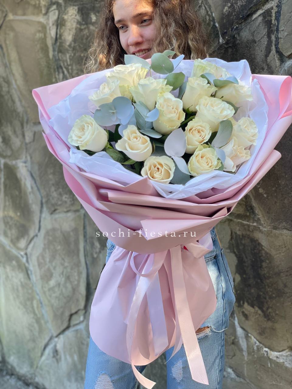 15 белых роз, лента, оформление фоамиран.