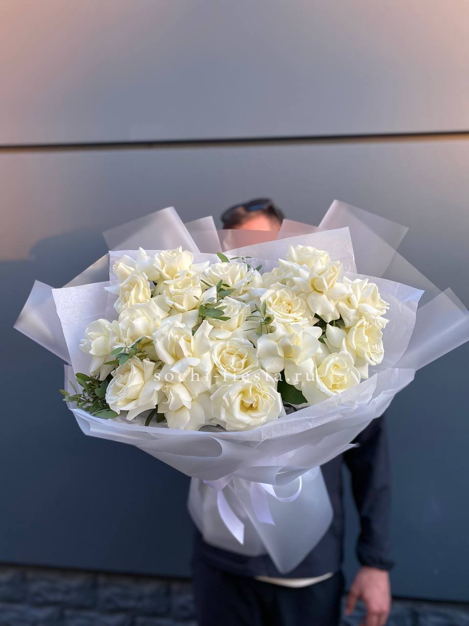 французские розы - 21 шт., эвкалипт - 2шт., лента, авторская упаковка.