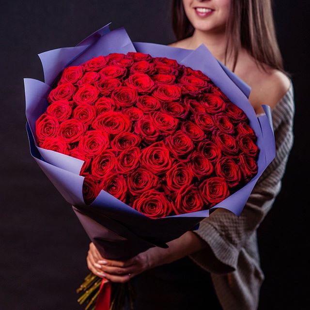 Полсотни алых бутонов образуют объемную композицию с выразительным присутствием. Классическая форма сохраняет четкость линий и долго радует свежестью.