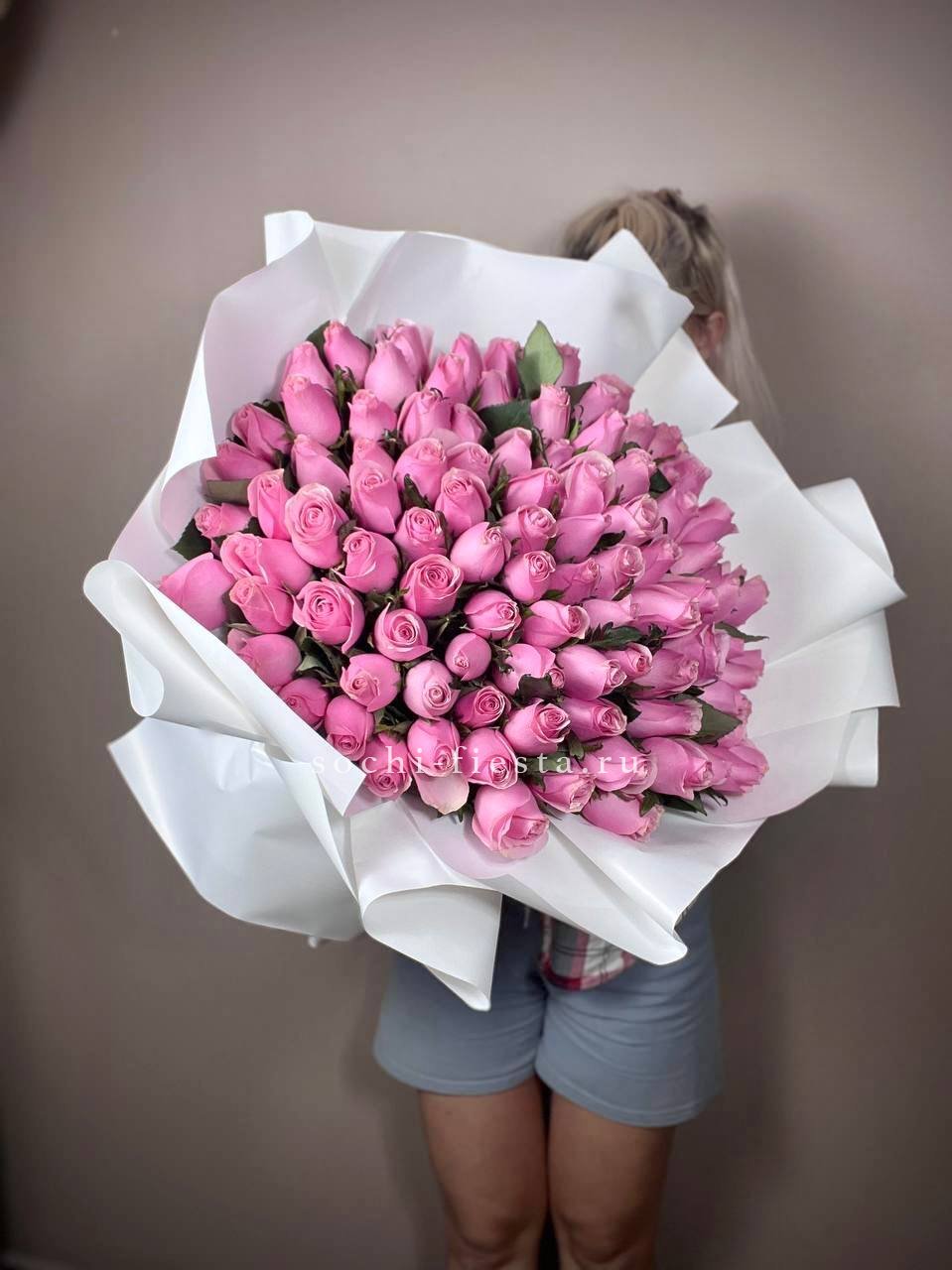 Сто одна роза в розовой гамме выстраивается в масштабную композицию. Такой букет заполняет всё видимое пространство и создаёт впечатление цветочной инсталляции с первого взгляда.