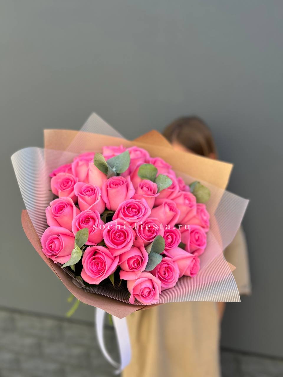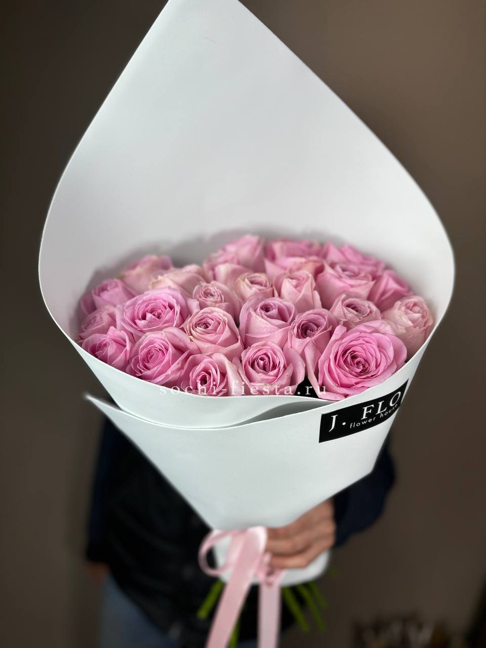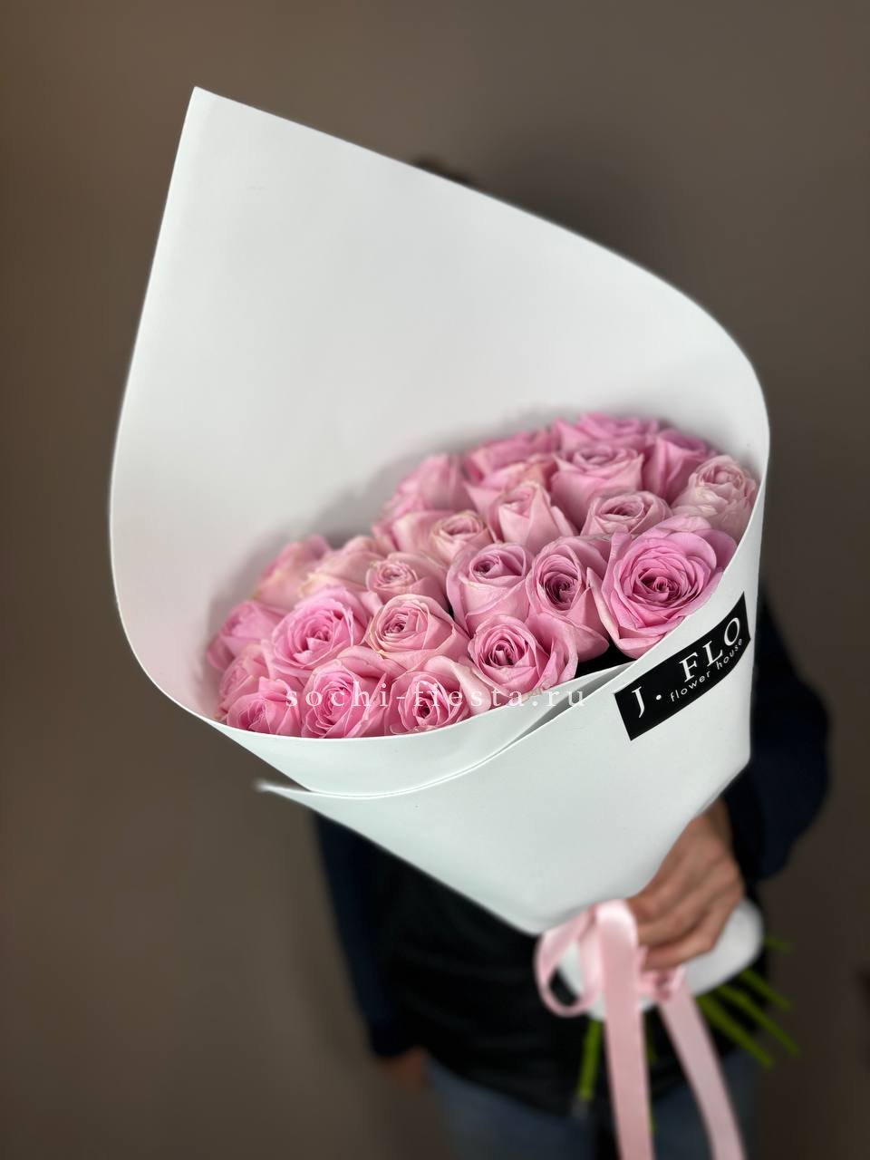 Двадцать пять бутонов с бархатистыми лепестками собраны в округлую форму, которая держит объём и создаёт мягкое розовое облако. Такой букет легко размещается в вазе и сохраняет свежесть долгое время.