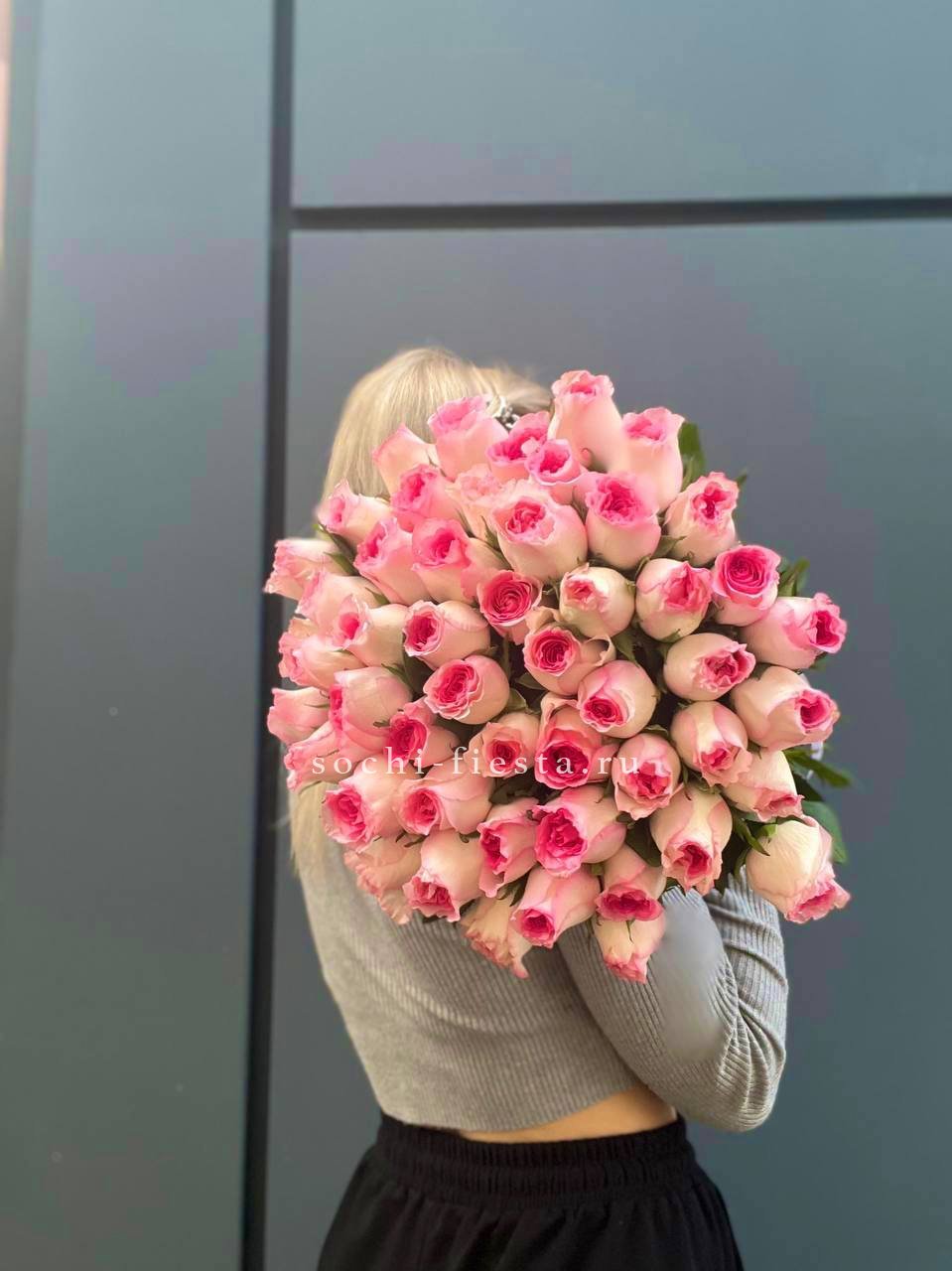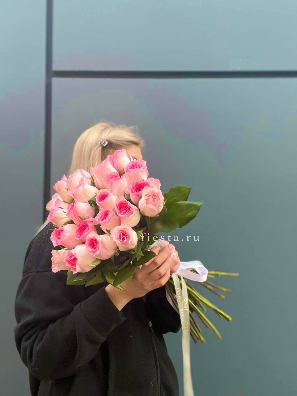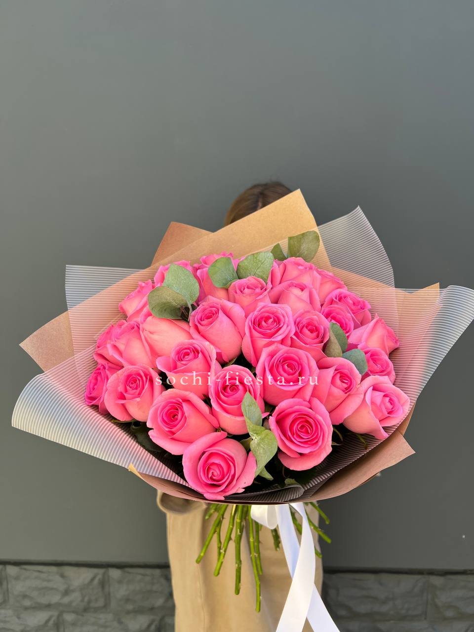 Двадцать пять бутонов с бархатистыми лепестками собраны в округлую форму, которая держит объём и создаёт мягкое розовое облако. Такой букет легко размещается в вазе и сохраняет свежесть долгое время.