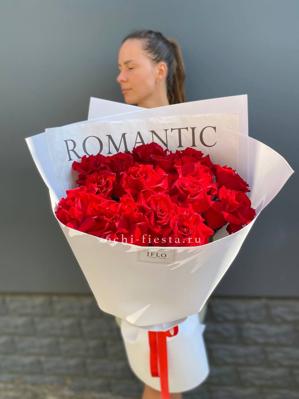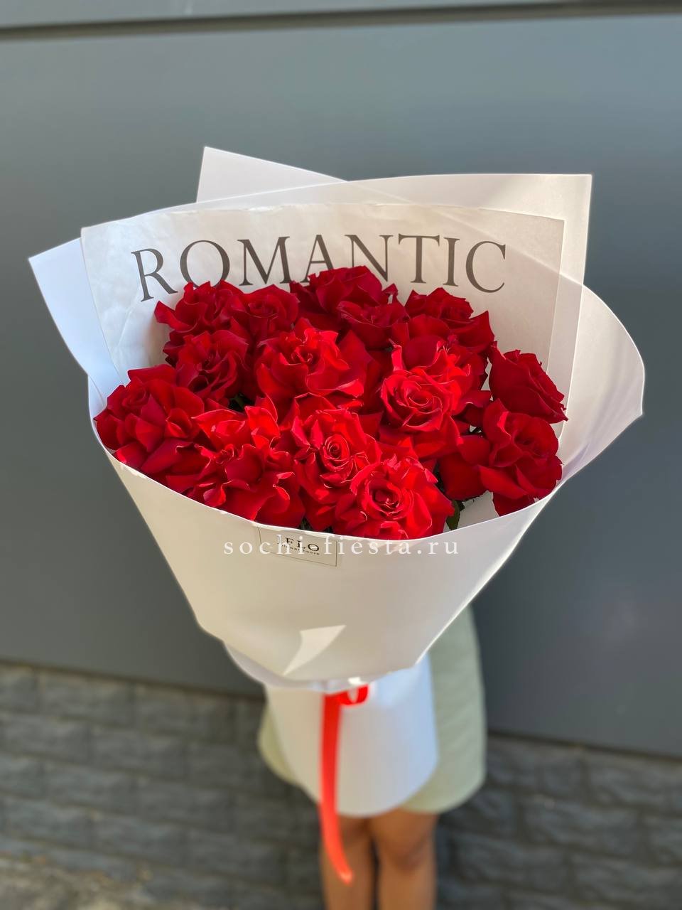 Девятнадцать красных роз с ажурной фактурой лепестков раскрываются постепенно, обнажая глубину каждого бутона. Фоамиран добавляет мягкости силуэту и завершает форму.