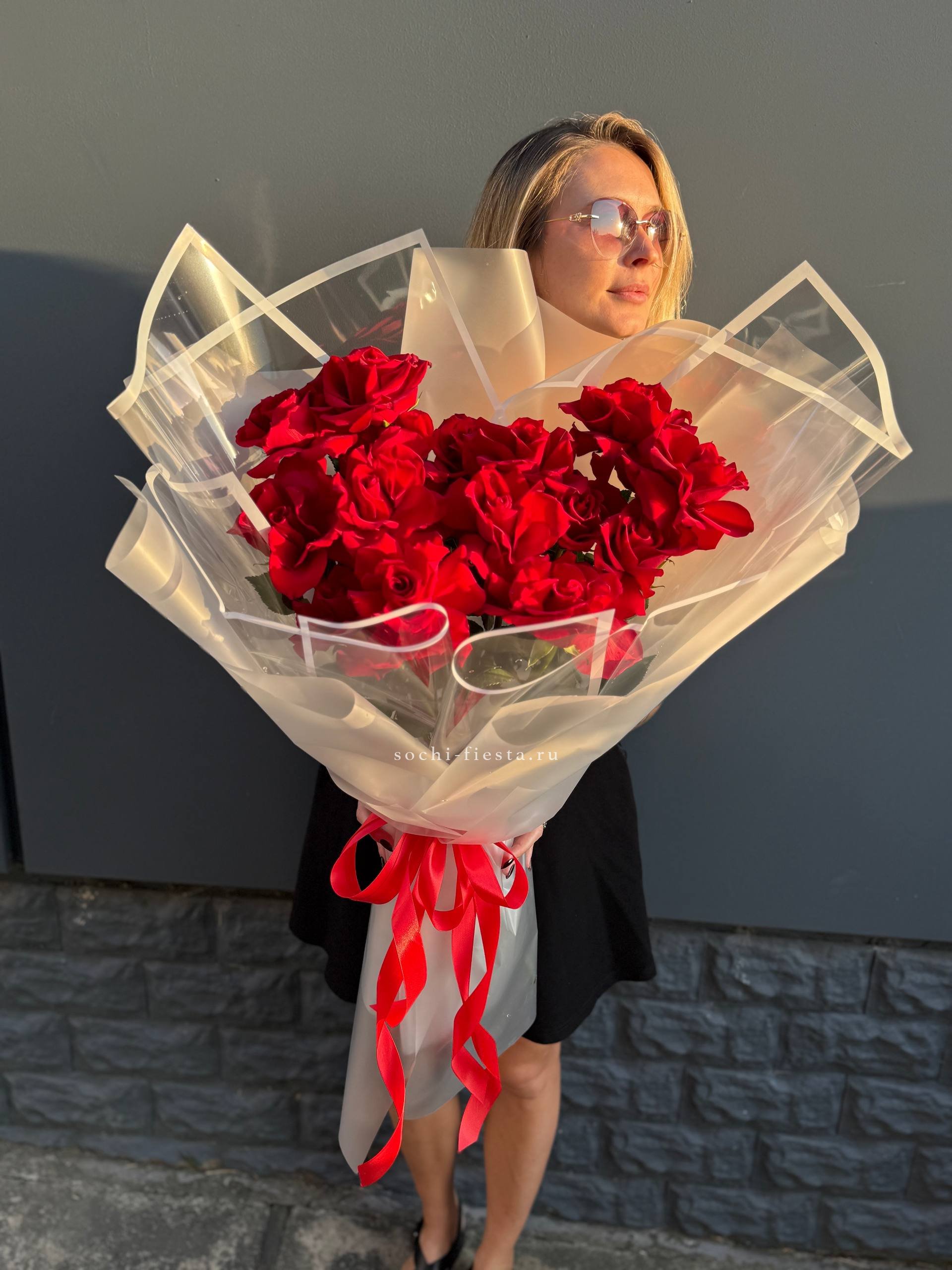Двадцать пять бутонов выстраиваются в пышную композицию с чётким ритмом и объёмным силуэтом. Голландские розы создают впечатление монументальности и уверенной подачи.
