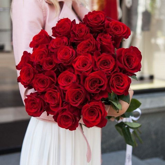 Compliment — это двадцать пять красных роз на длинных стеблях, собранных в классическую форму. Букет держит форму несколько дней и остаётся аккуратным даже в высокой вазе.