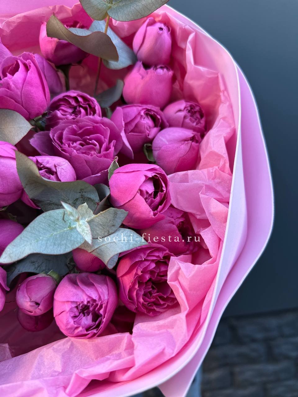 Двадцать один стебель кустовой розы собран в свободную композицию. Многоцветковые веточки формируют воздушный объем с естественным ритмом расположения бутонов.