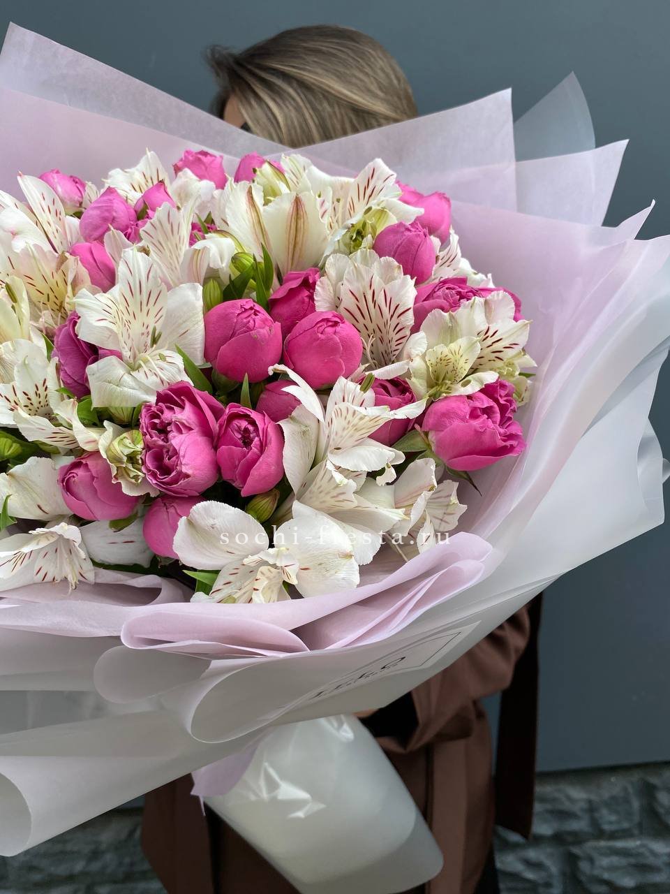 кустовые пионовидные розы, альстромерии, тишью, пленка и лента.