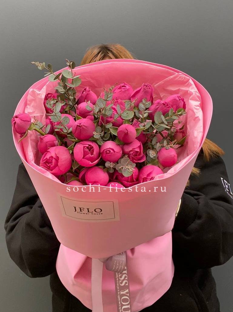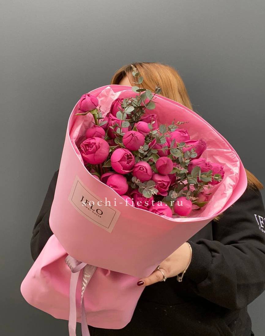 9 пионовидных роз Мисти Бабблс, эвкалипт, зелень, дизайнерская упаковка, лента.