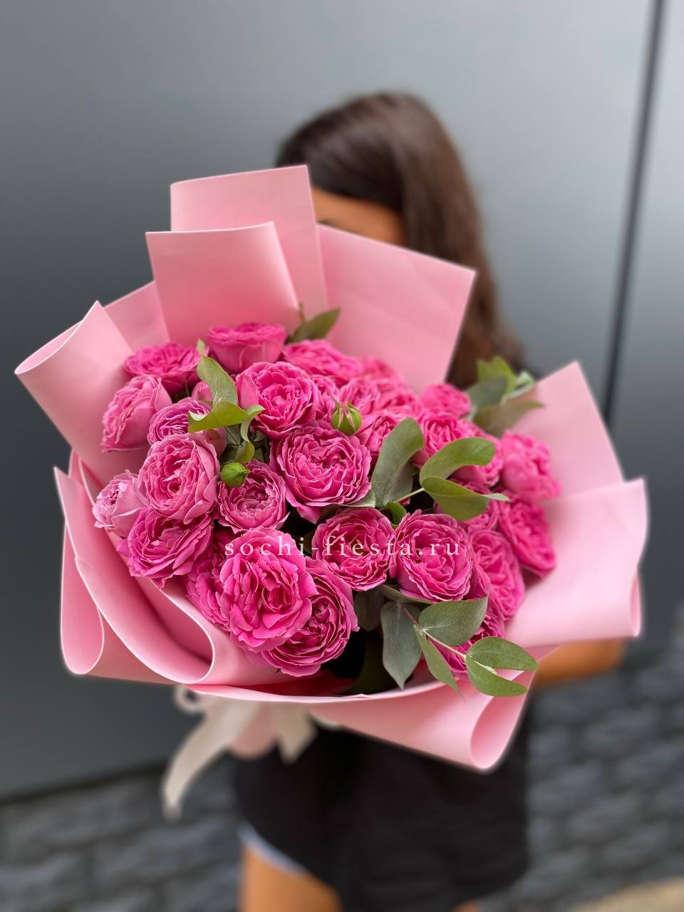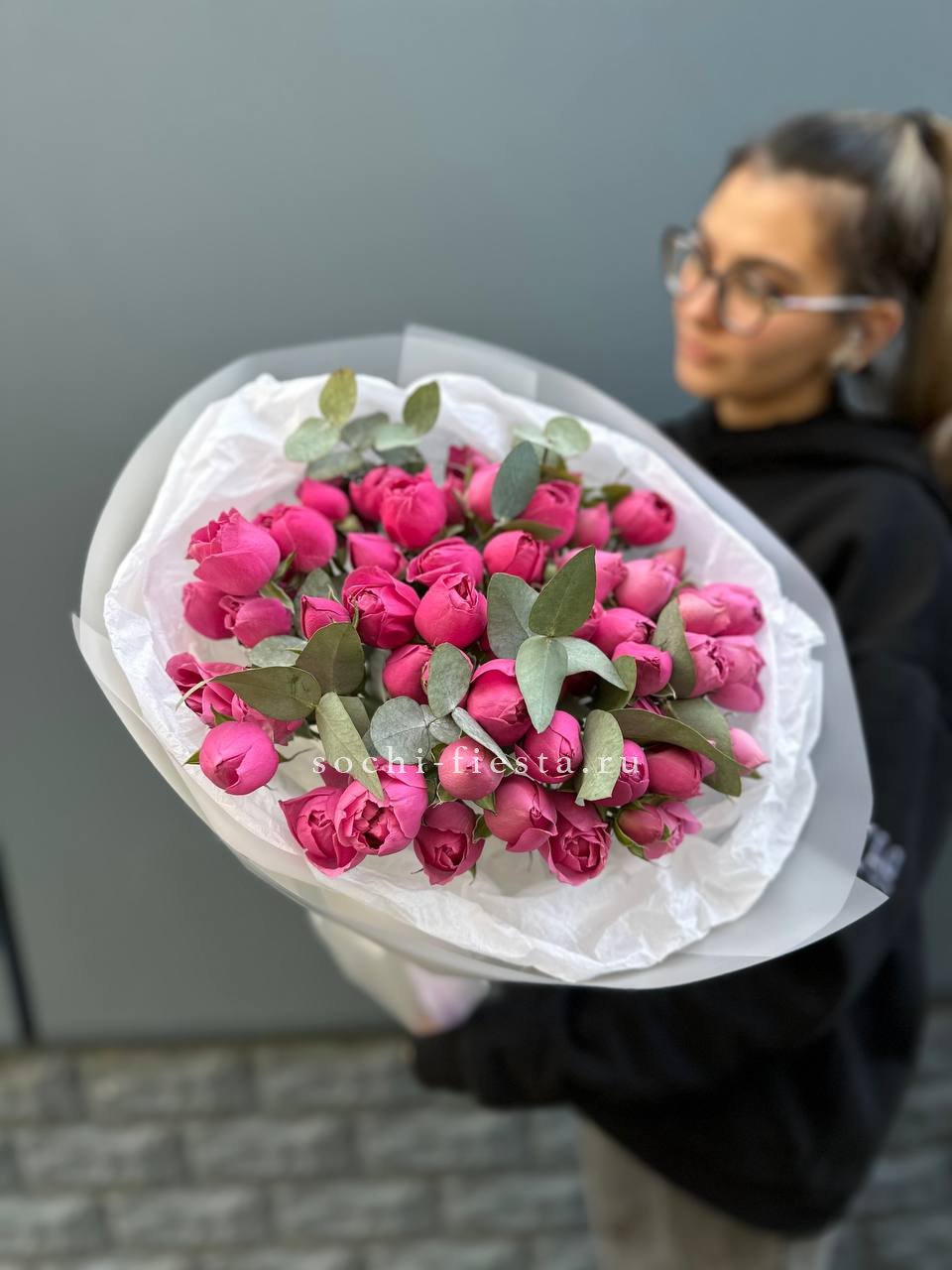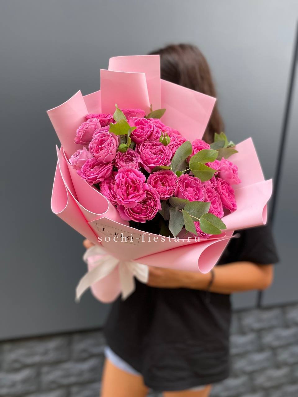 Пятнадцать роз Мисти Бабблс с пышными многослойными бутонами создают объёмную композицию с живой текстурой. Лепестки раскрываются волнами, образуя плотную шапку с мягкими переходами оттенков. Веточка эвкалипта добавляет свежести и завершает образ.
