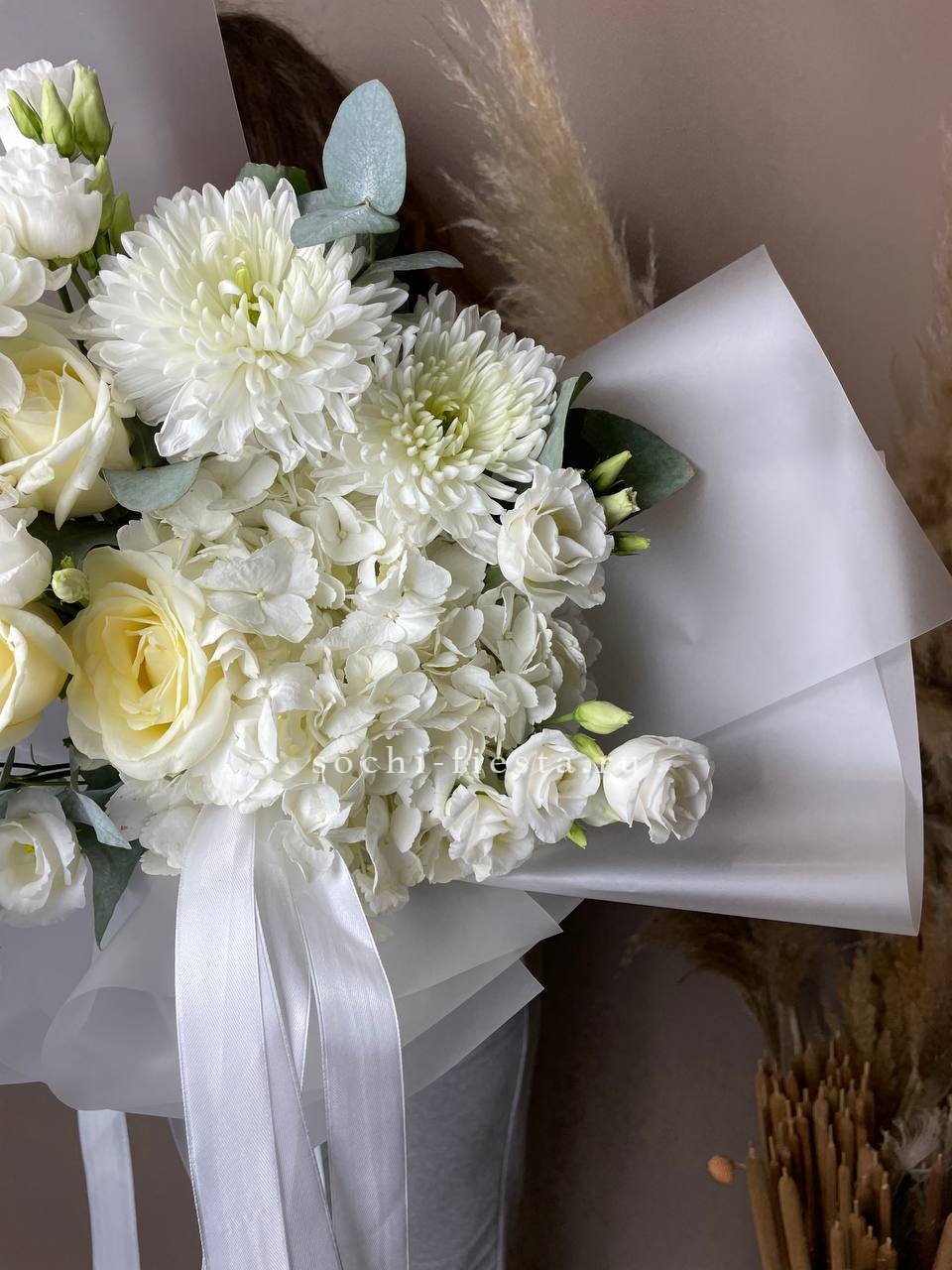 Пышная шапка гортензии переходит в розовые розы и маттиолы, создавая многослойную структуру. Эвкалипт обрамляет композицию, добавляя графичности и свежести.