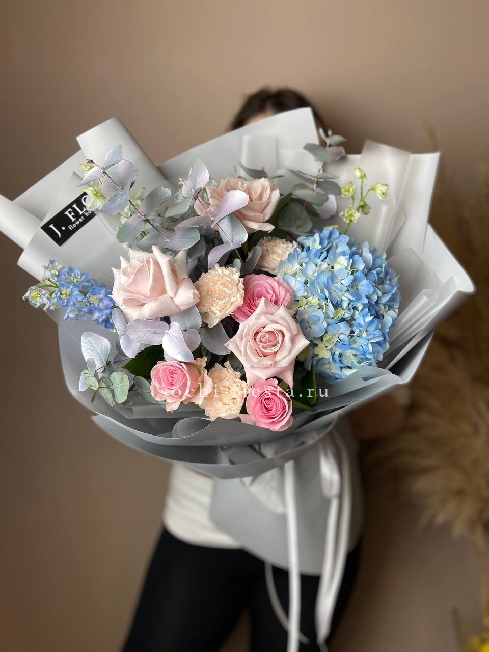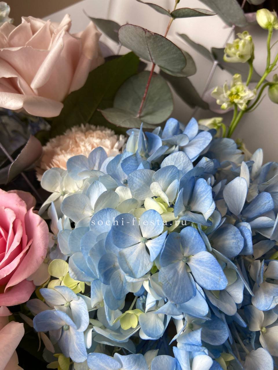 гортензия белая голландская, пионовидная роза Мисти Бабблс, оформление.