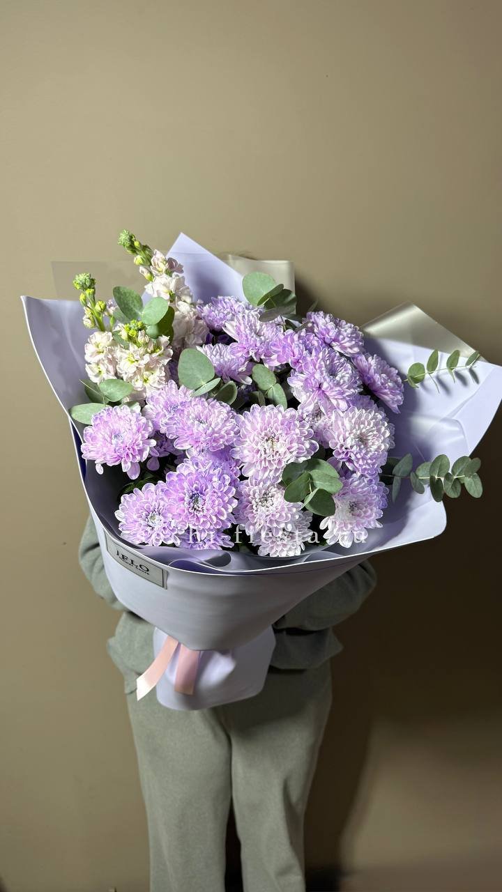 Белые розы и эустома образуют воздушный объем, где каждый бутон дышит свободно. Диантус добавляет графичности, а эвкалипт создает прохладную дымку по краям. Букет для тех, кто ценит легкость и современную флористику.