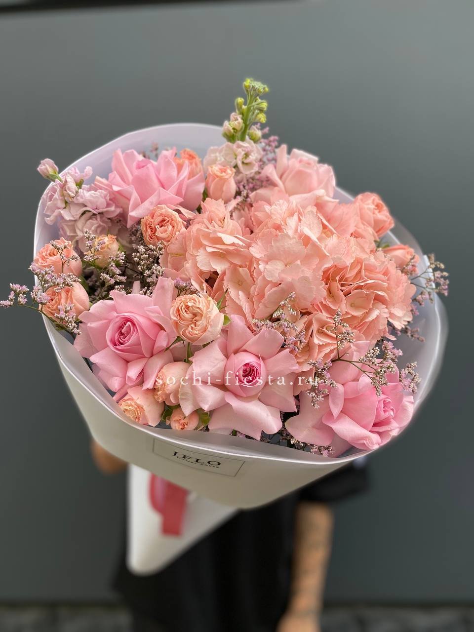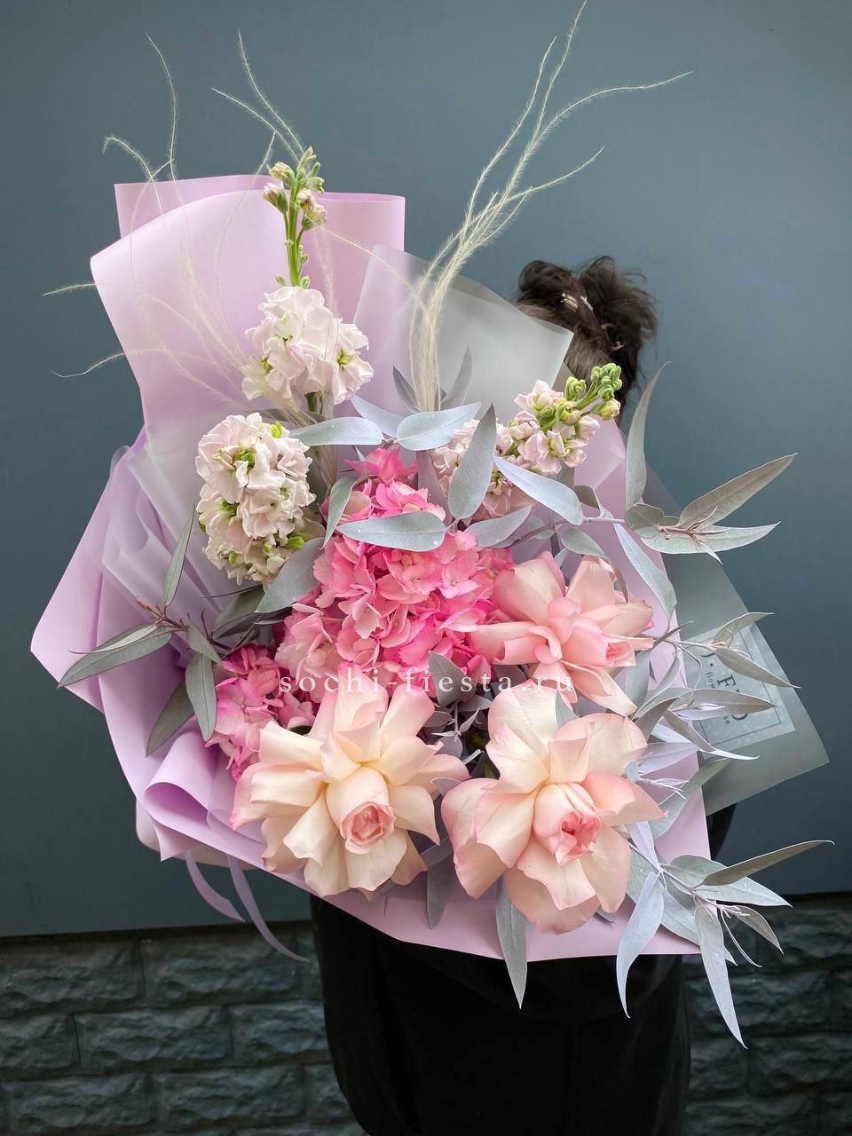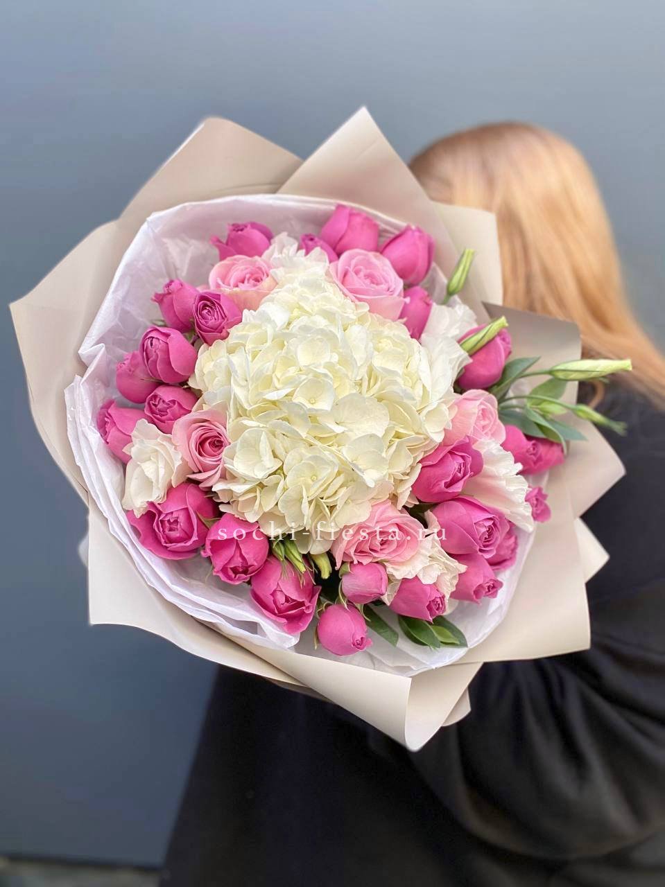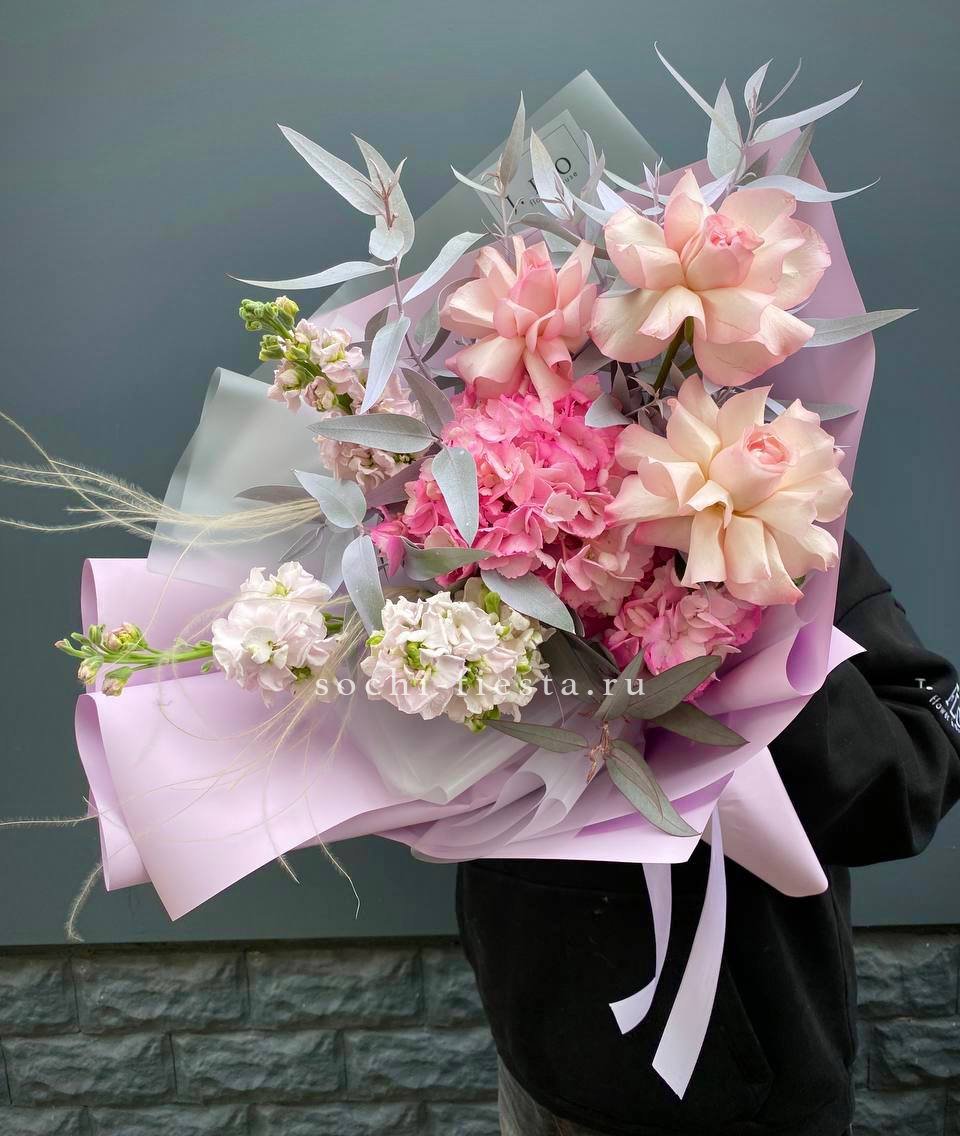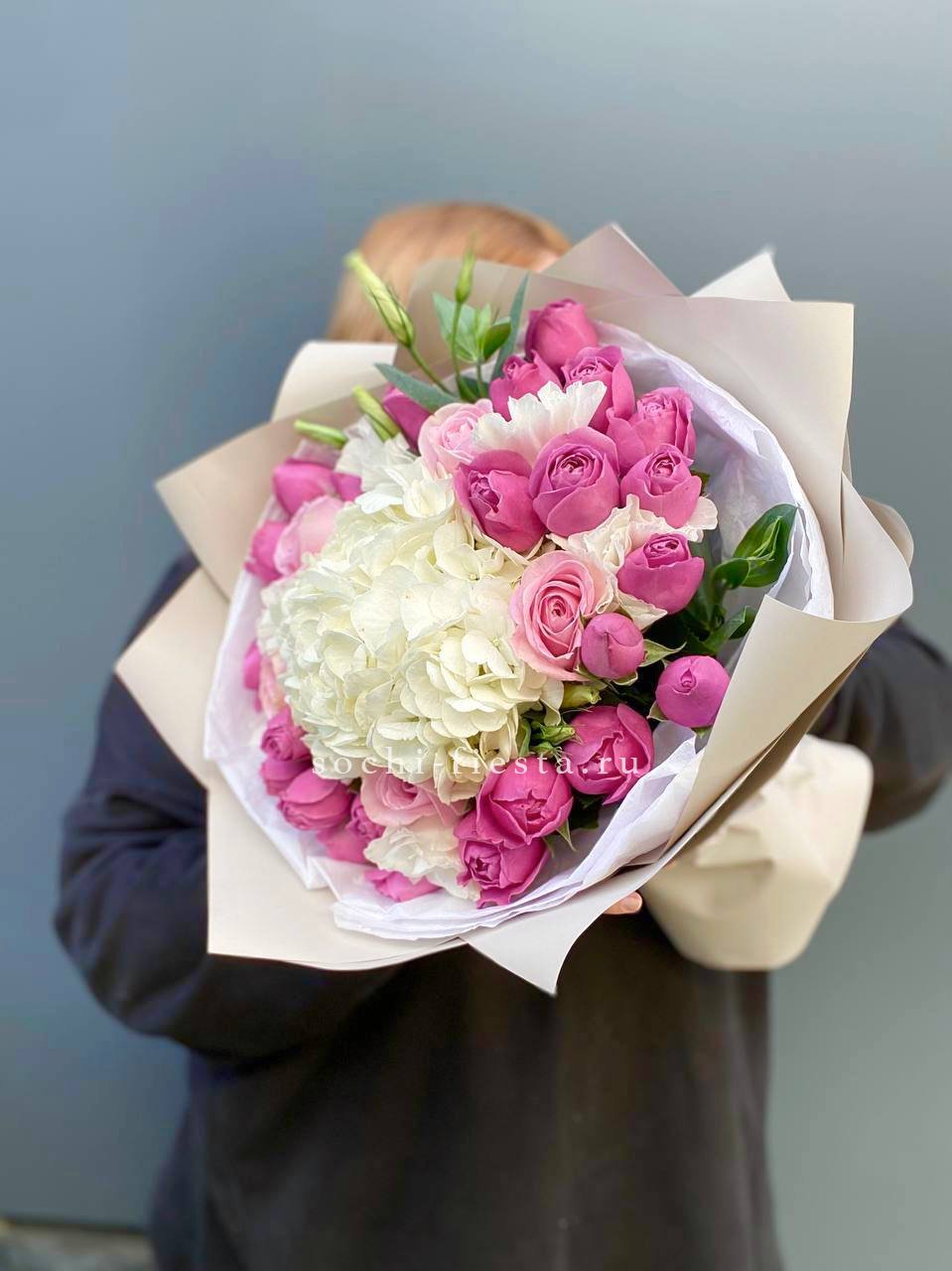 гортензия, хризантема, роза, эустома, упаковка, лента.