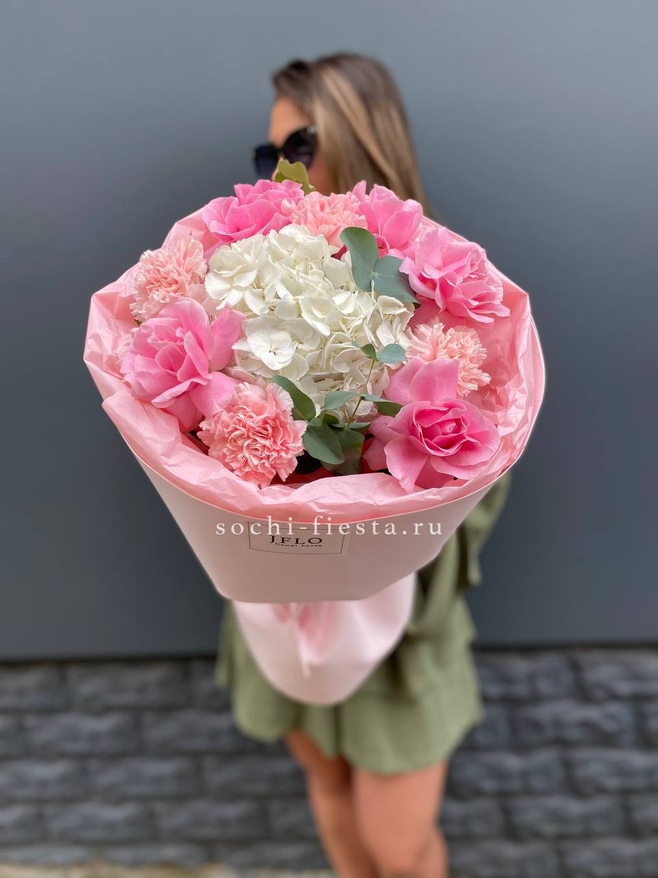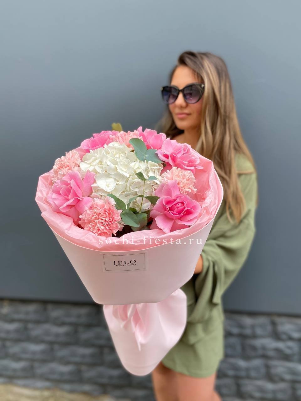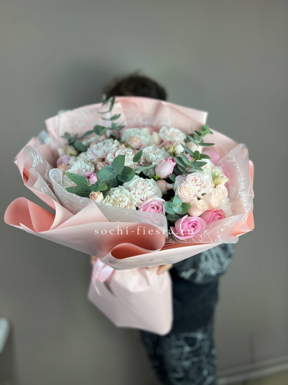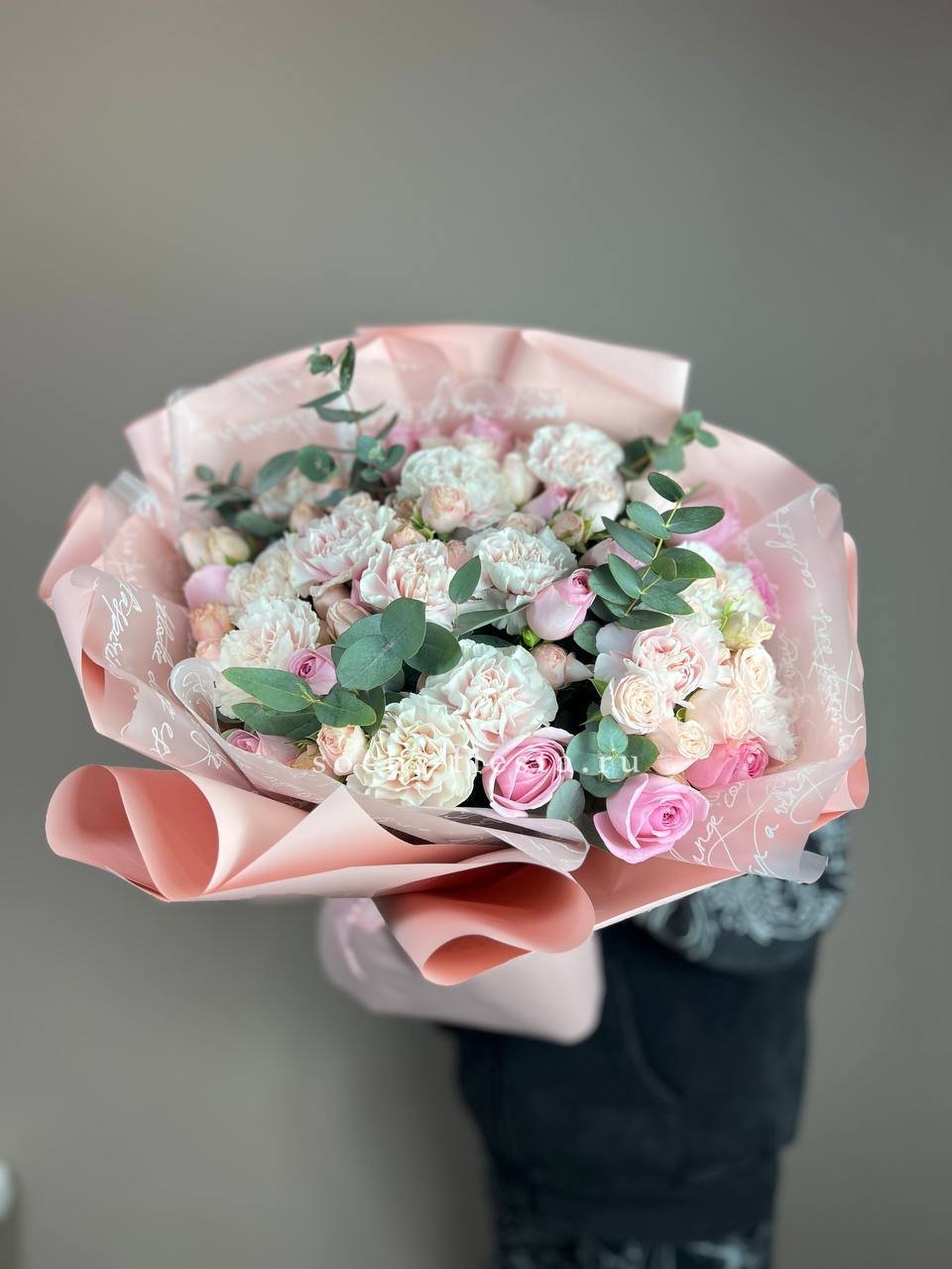 Розовые розы и диантусы окружены пышными соцветиями маттиолы и бомбастика. Композиция собрана плотно, каждый цветок поддерживает соседний, создавая объемную округлую форму. Букет держит силуэт и выглядит цельно с любого ракурса.