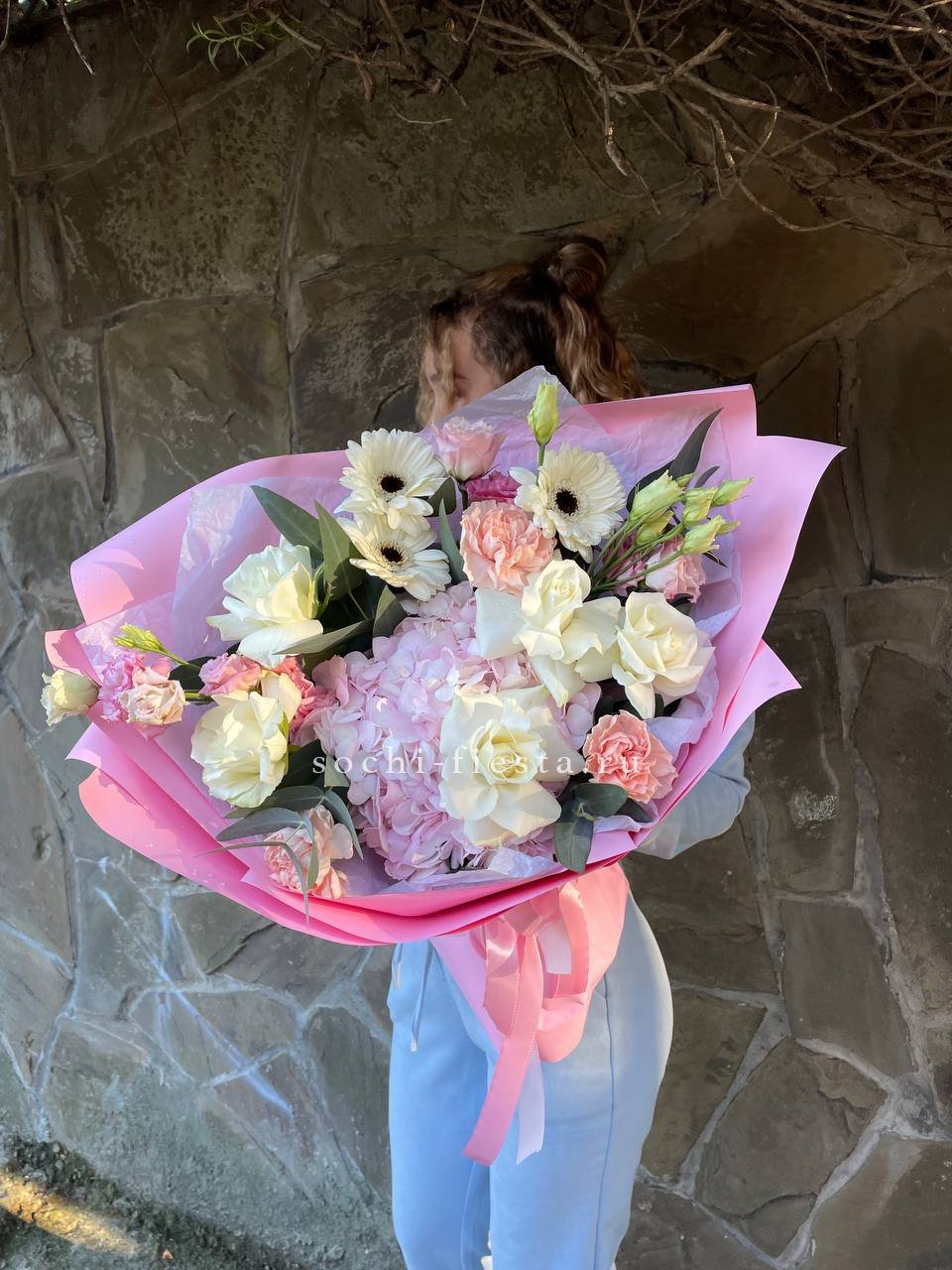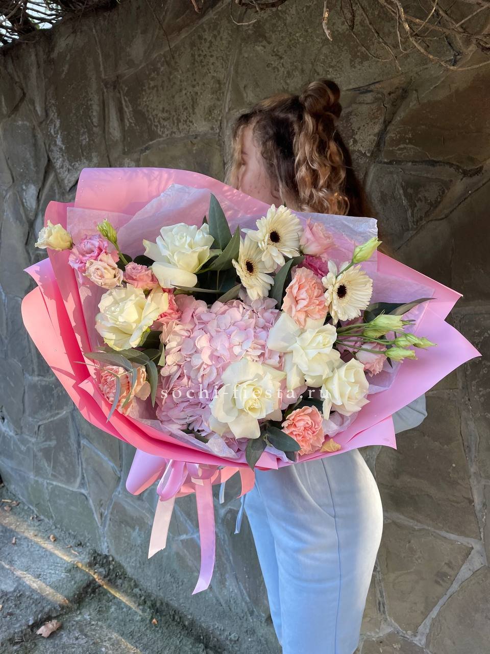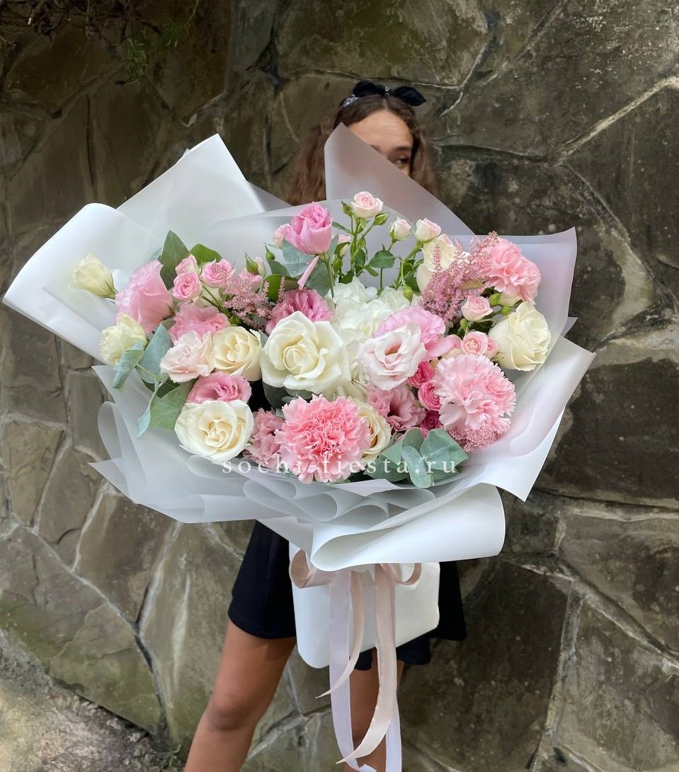 Белые розы и эустома образуют светлую основу, которую дополняют пионы и гортензия. Крафтовая упаковка удерживает форму, позволяя цветам раскрыться естественно и свободно.