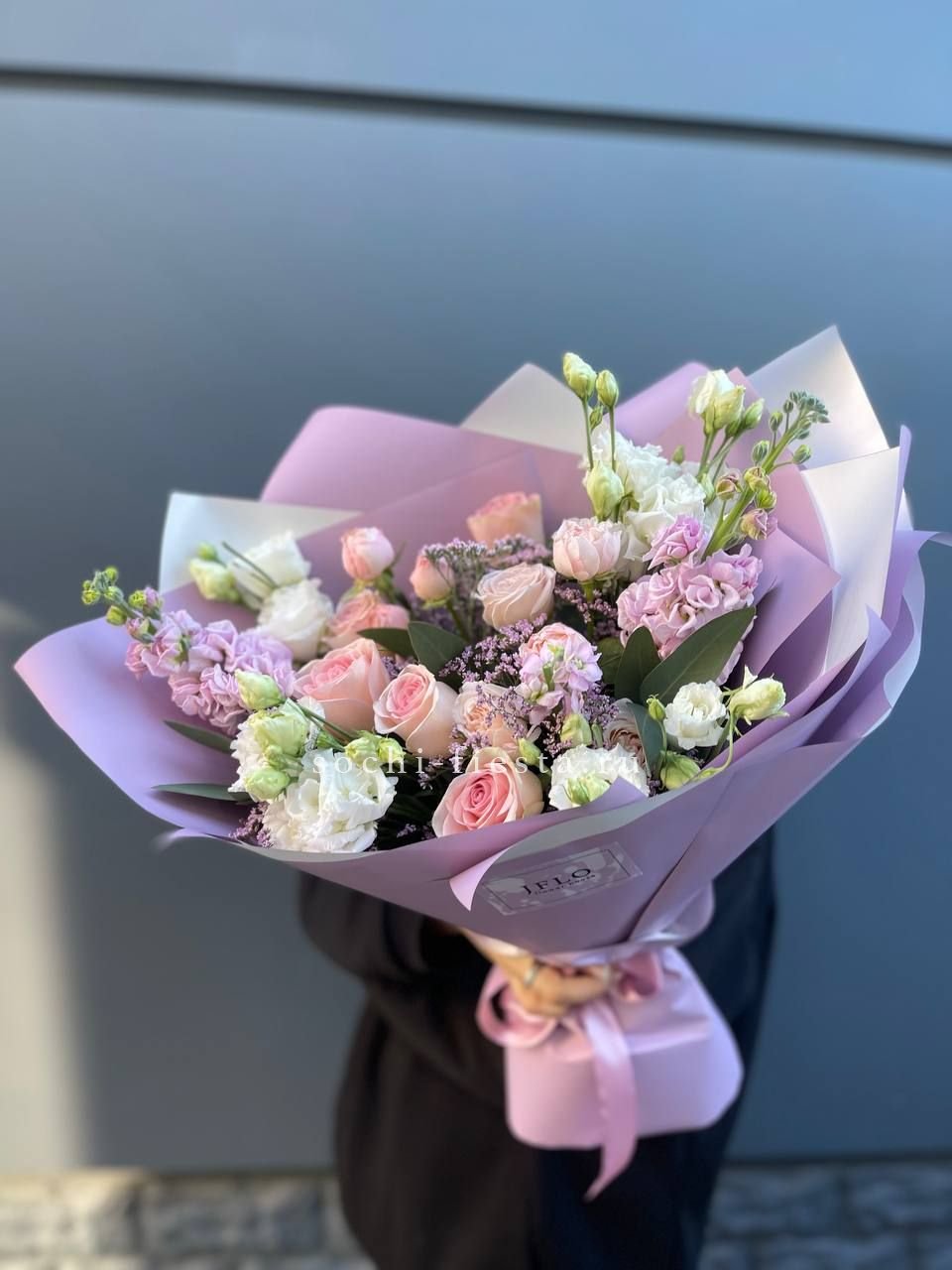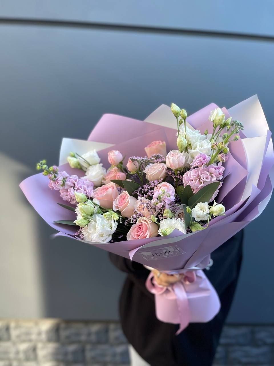 Кустовые розы и эустомы собраны в компактную форму с мягкими линиями. Сочетание нескольких оттенков создаёт живописный эффект без лишней пышности.