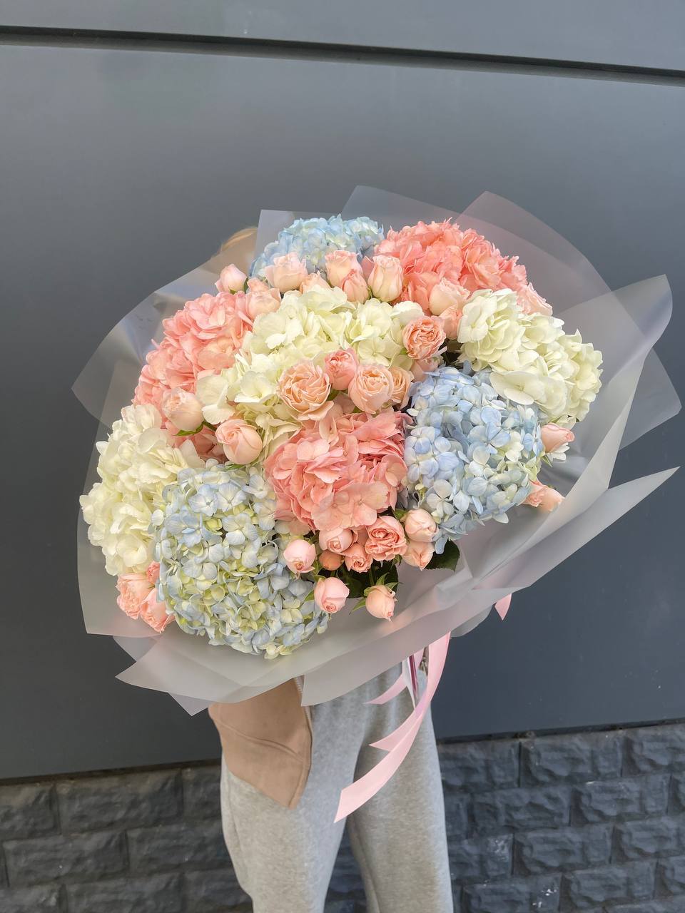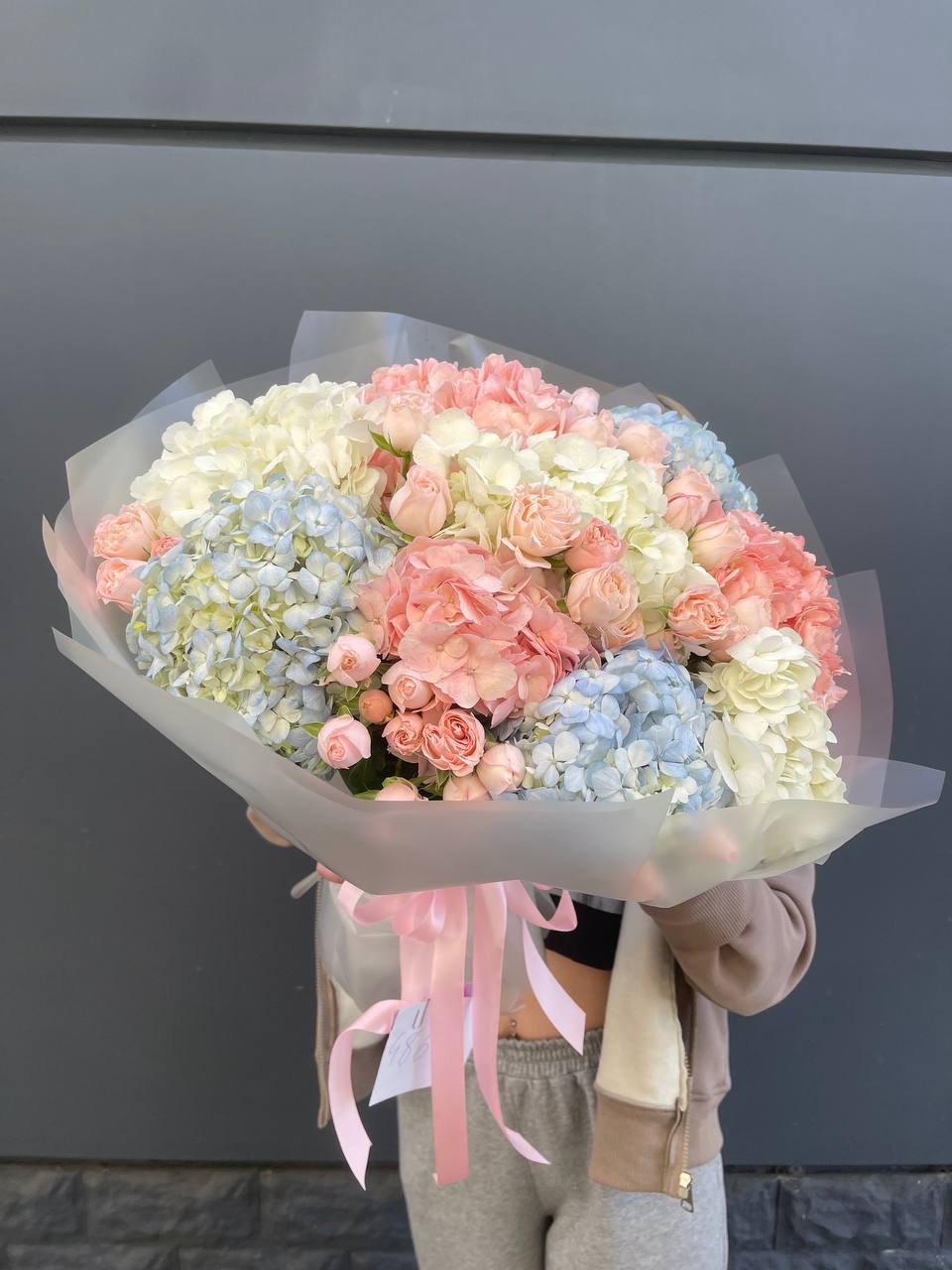 Белоснежные розы и пышные шапки гортензии сплетаются в плотную композицию, где эвкалипт задаёт спокойный ритм. Букет хорошо держит форму и долго сохраняет свежесть в вазе.
