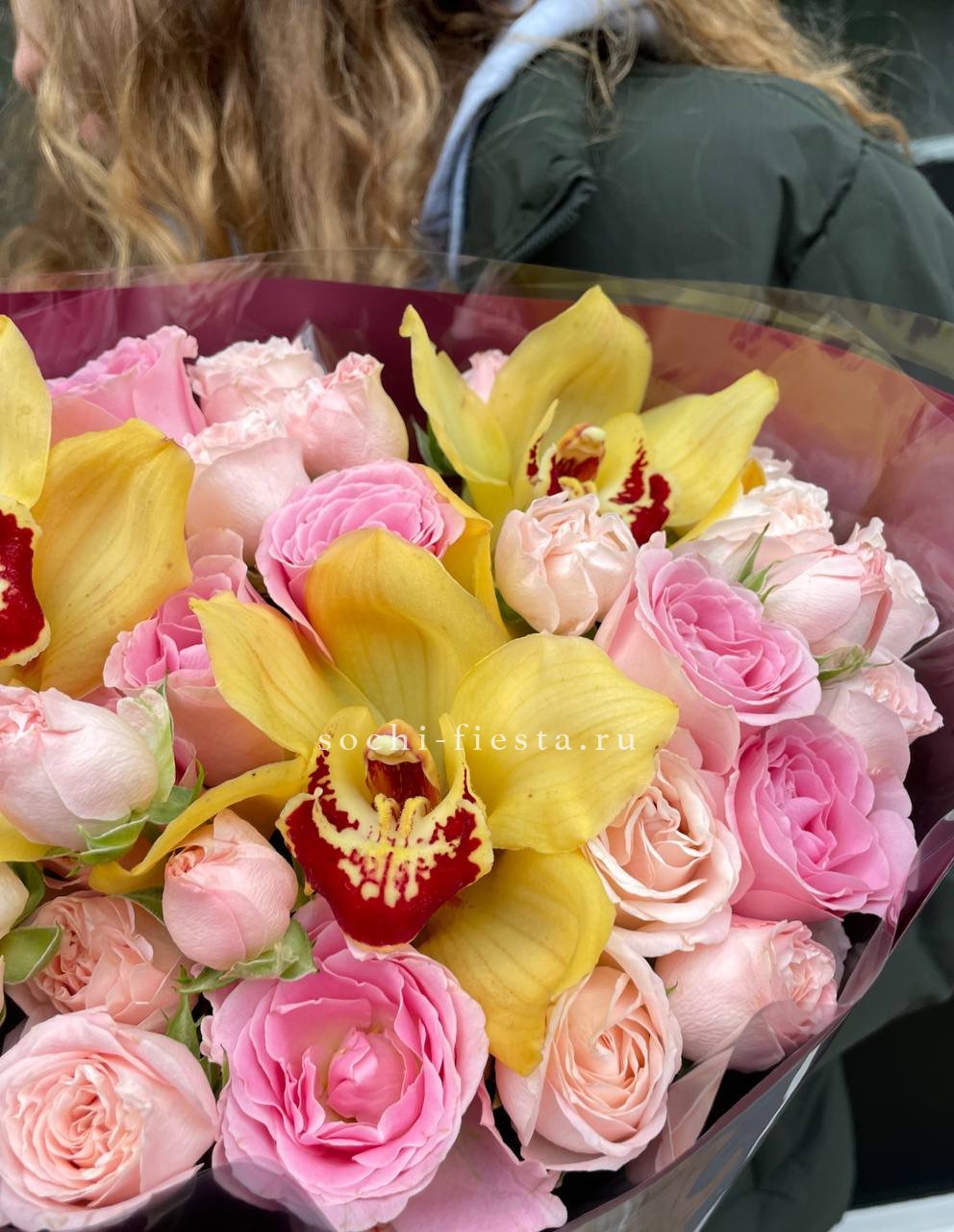 орхидея, роза, пионовидная роза бомбастик,  лента, дизайнерская пленка.