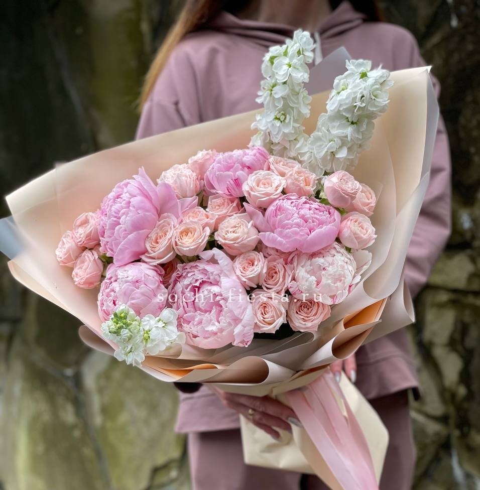 розовые пионы Сара Бернар, пионовидная кустовая роза, маттиола, лента, дизайнерская упаковка.
