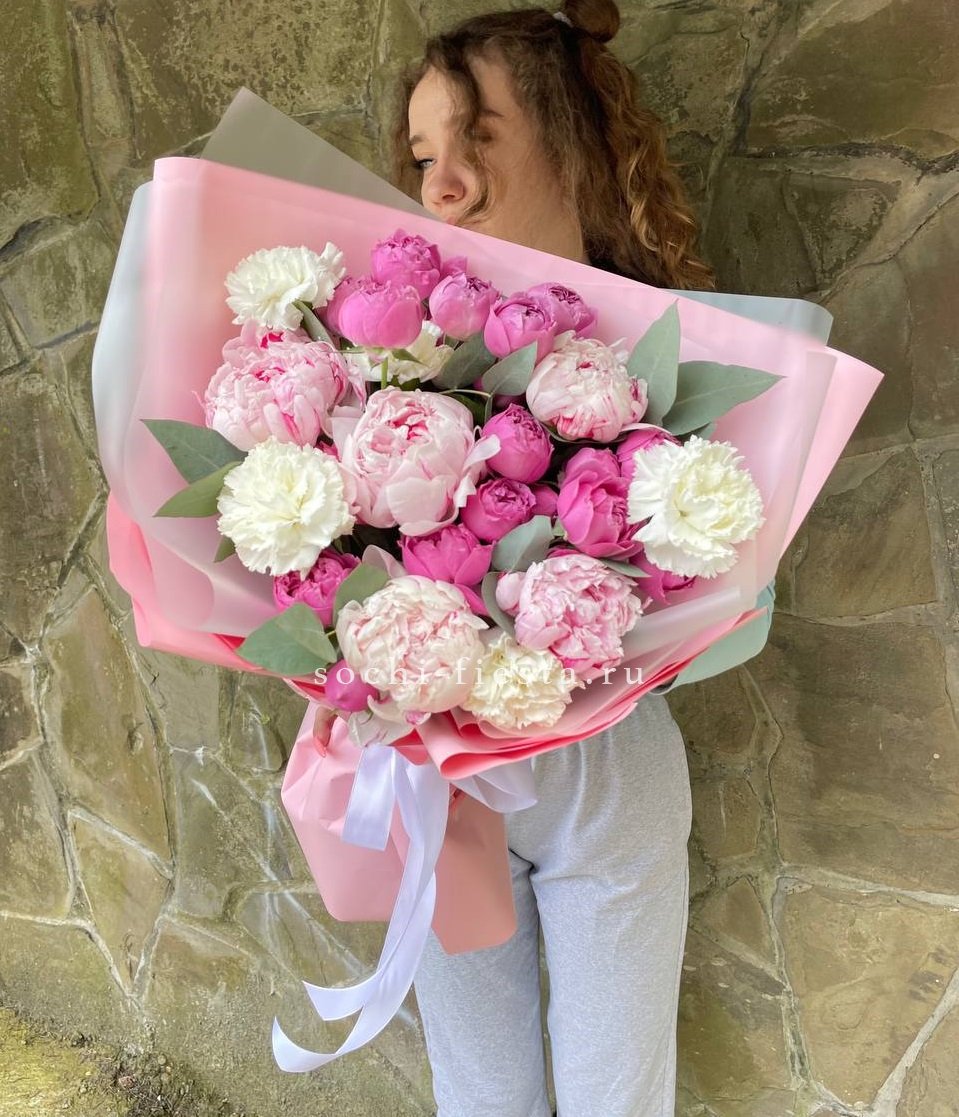 пионовидные розы, розовые пионы, диантусы, эвкалипт, лента, дизайнерская упаковка.