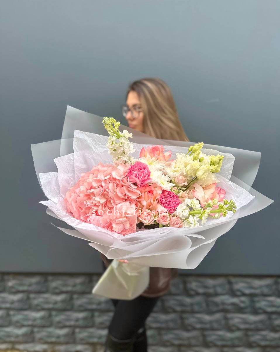 Плотная сборка с пышной гортензией в центре и рассыпчатыми соцветиями диантуса по краям. Эустома добавляет воздушности, а ветки озатамуса создают лёгкую графику. Букет держит форму и выглядит объёмно с любого ракурса.