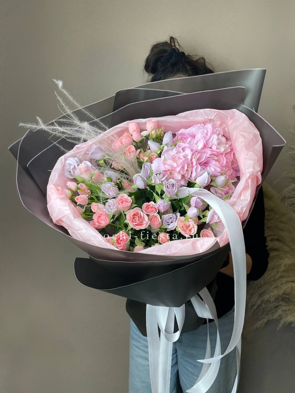 Фиолетовые оттенки переходят от насыщенной гортензии к лиловым бутонам роз и статицы. Гвоздика и эустома разбавляют глубину палитры светлыми акцентами.