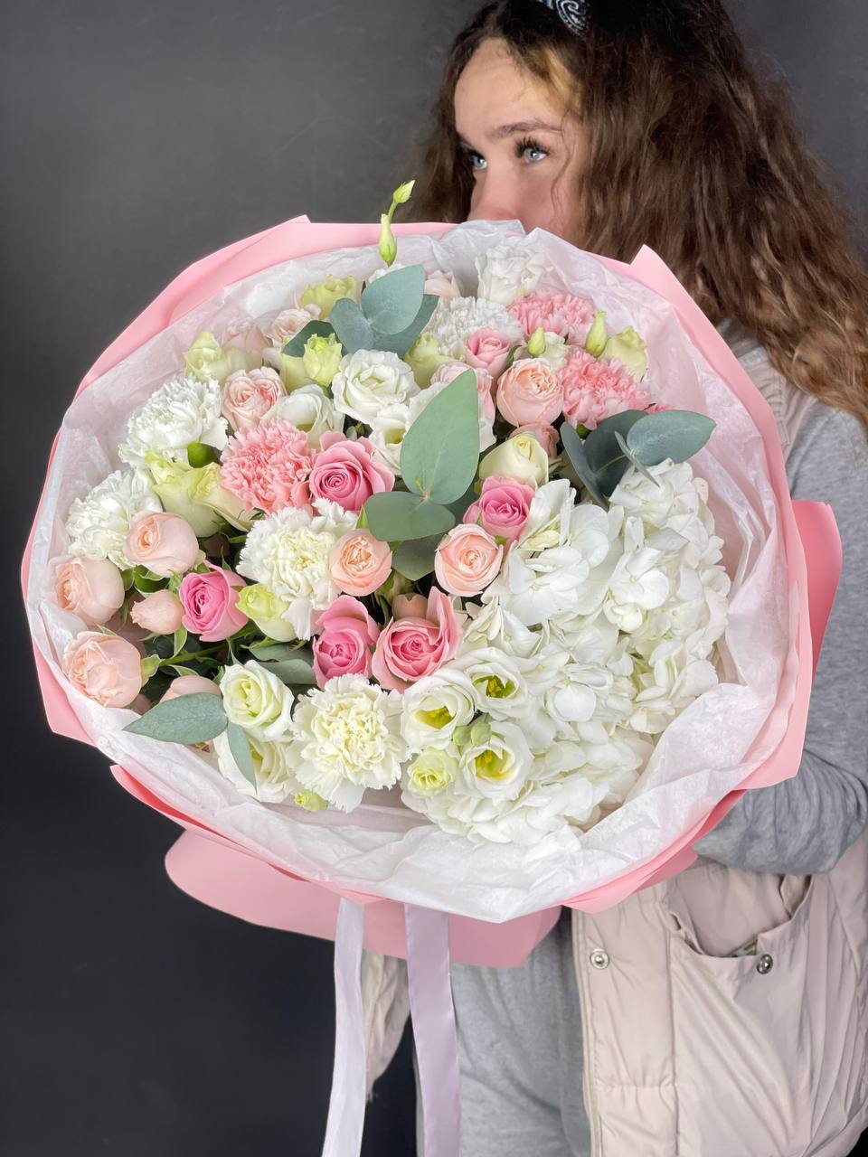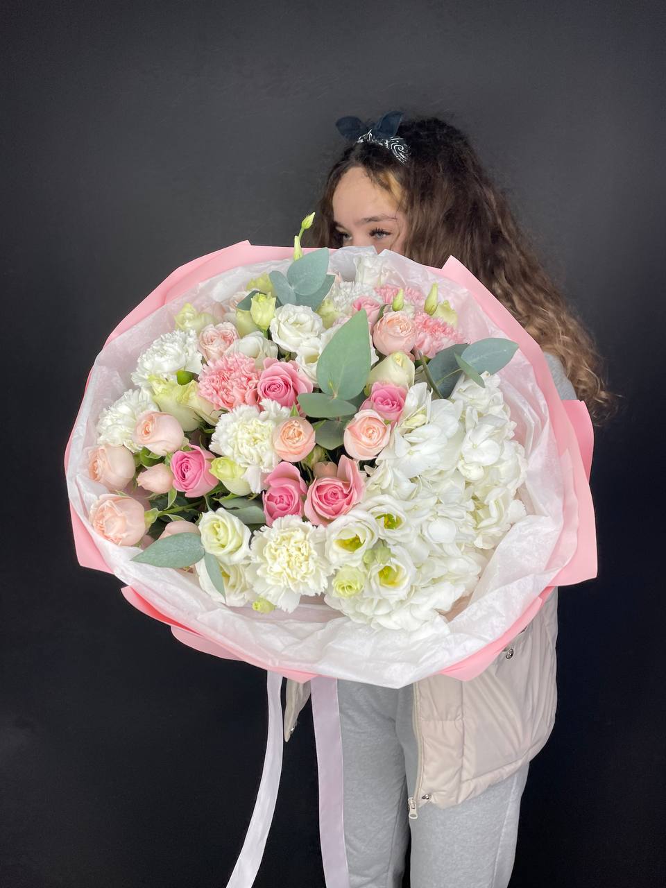 розовые розы, белые розы, диантус, бомбастик, гортензия, эвкалипт, пленка.