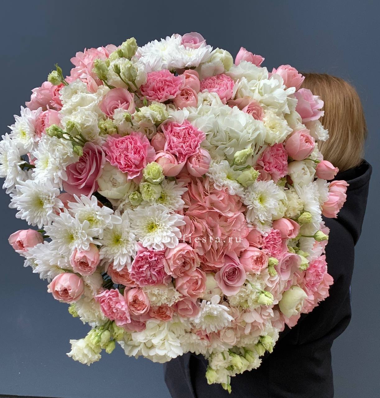 гортензия, гербера, диантус, эустома, свит ревиваль, кустовая роза, эвкалипт, лента, корейская пленка.