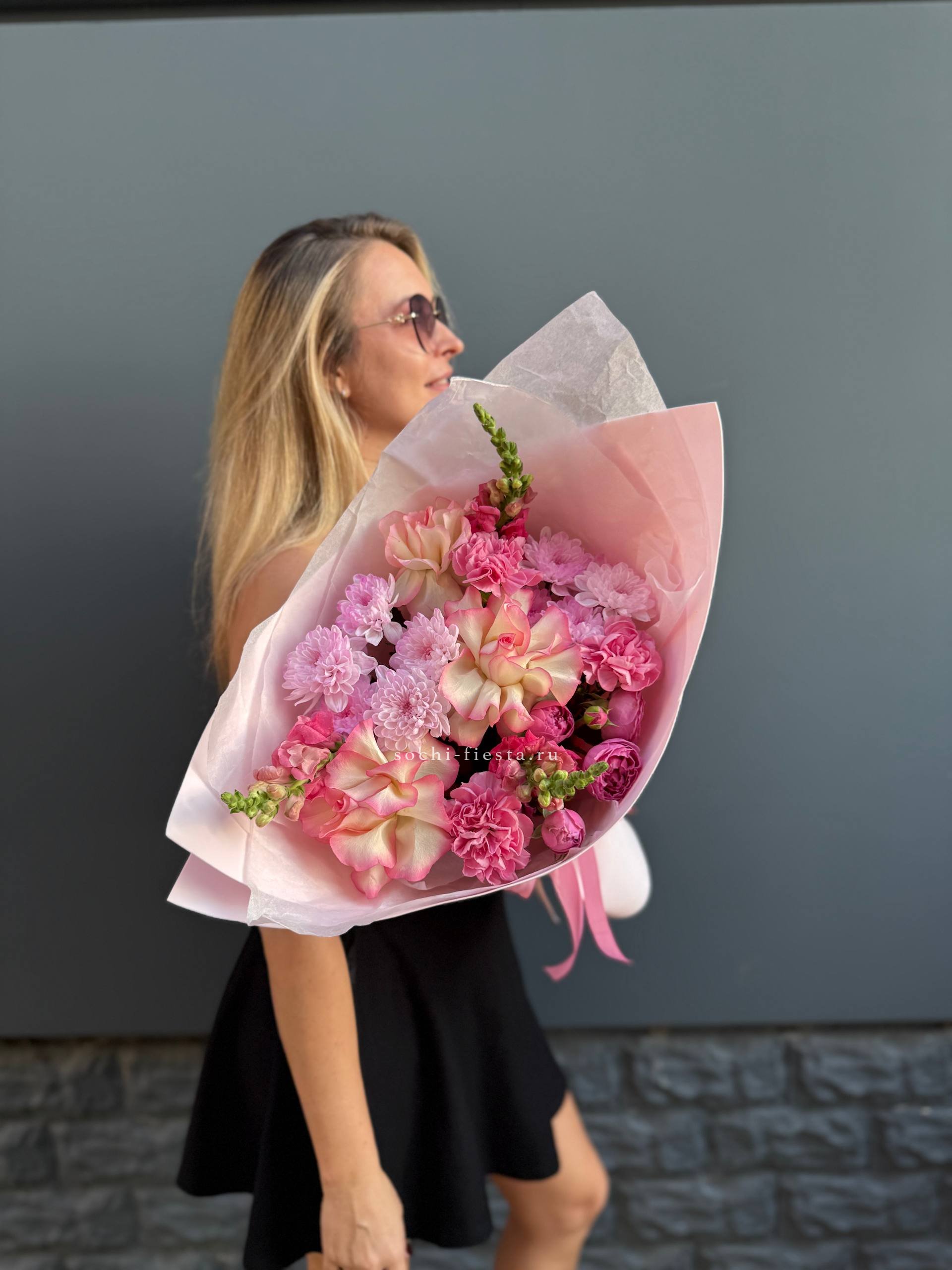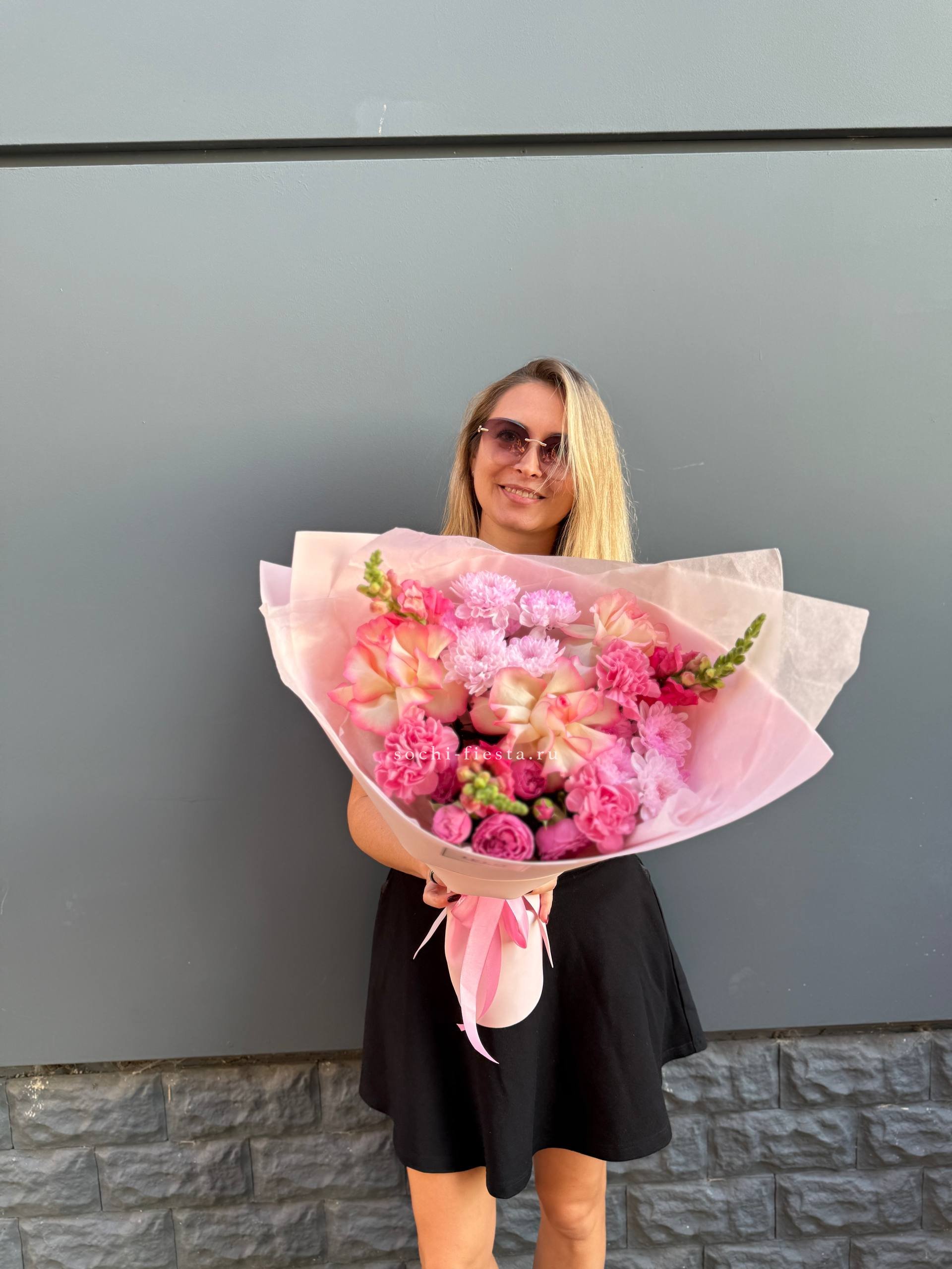 хризантемы, диантусы, розы, эустома, гортензия, лента, корейская пленка.
