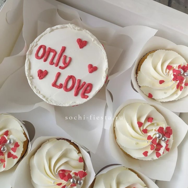 - Подарочный сет — торт, капкейки, букет и открытка в единой праздничной упаковке.